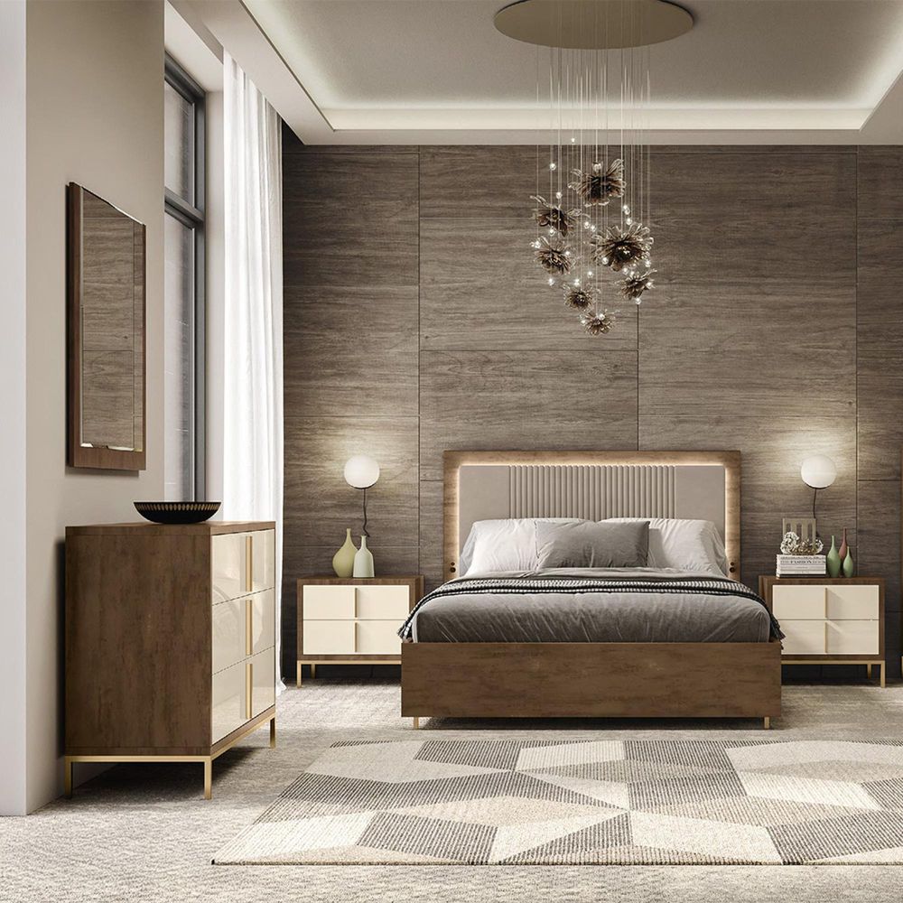 Item Code: 4002 Meridian night collection is a fascinating ensemble of furniture for the bedroom that comes from the traditional Made in Italy design but stands out for its modern cuts and combinations.This new model enchants with its shades between glossy ivory and matter rust effect rough brown, for an embracing and sophisticated setting.Meridian dresses up the sleeping area with style, starting with the majestic bed with padded headboard, covered in brown velvet or beige eco-leather and LED lights backlit.There are also USB sockets for a comfortable and functional room.The quality of Euro Design is also recognized in the bright surfaces of the dresser, bedside tables, tallboy and wardrobe, in the iron feet and in the opaque vertical handles painted in matt gold finish.All the furniture is made with thick furniture for extra strength and dresser, bedside tables, tallboy and wardrobe have the comfortable soft closing opening system.The wardrobe, expandible starting from modules with 2 doors, is essential but elegant in its shaped and slender structure. The sides are finished in matter rust effect rough brown, the front doors are in glossy ivory and external mirrors..This is a Made to Order itemAll Made to Order items are manufactured as per the order supplied by you.We are unable to accept cancellation or accept any extra cost that may incur due to wrong information provided by you at the time you placed the order.We will confirm all sizes/colours/finishes in written email (order confirmation) with you before going ahead with production of your order.