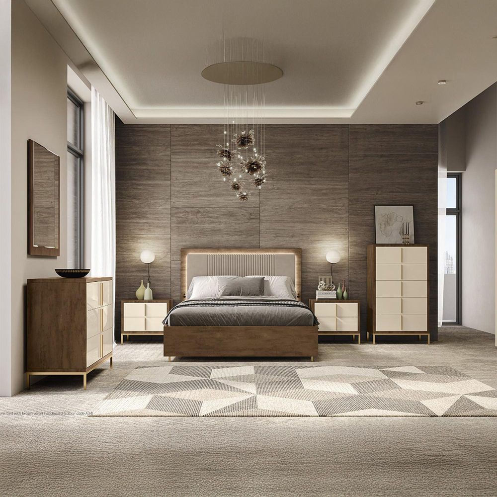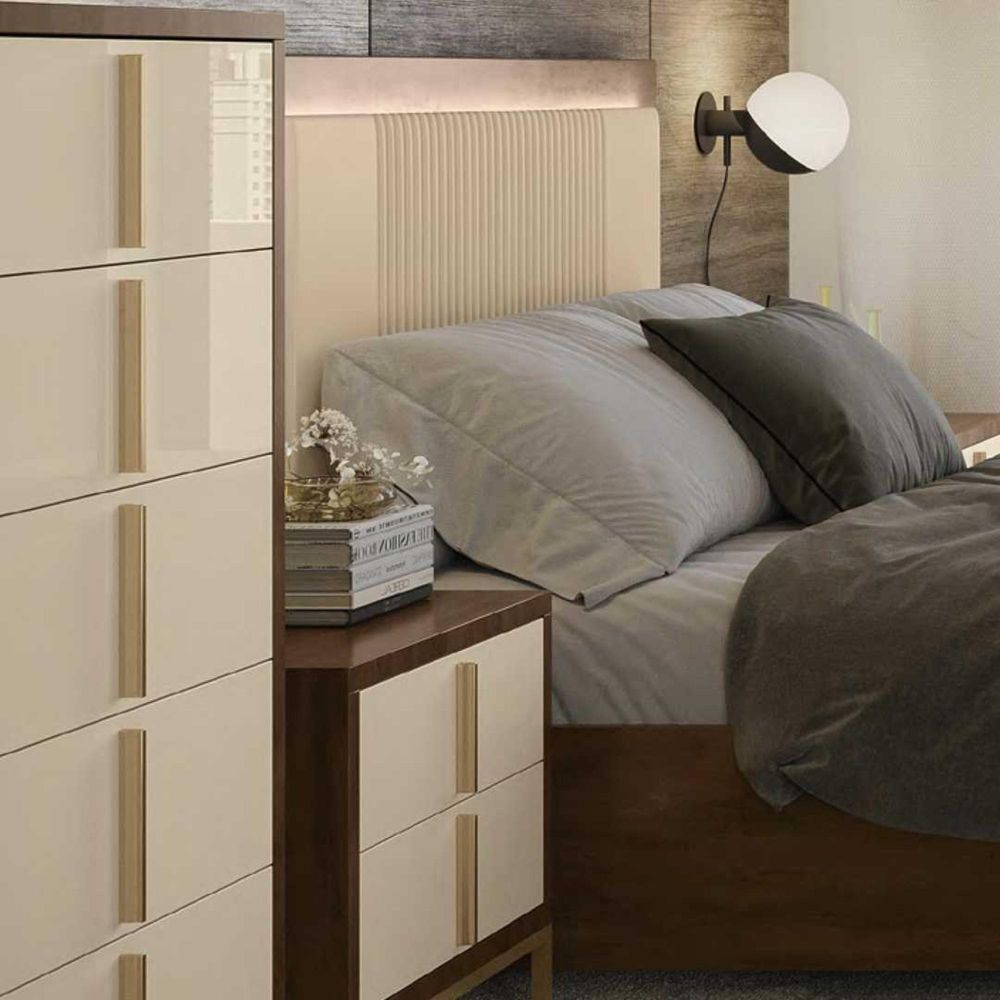 Item Code: 4009 Meridian night collection is a fascinating ensemble of furniture for the bedroom that comes from the traditional Made in Italy design but stands out for its modern cuts and combinations.This new model enchants with its shades between glossy ivory and matter rust effect rough brown, for an embracing and sophisticated setting.Meridian dresses up the sleeping area with style, starting with the majestic bed with padded headboard, covered in brown velvet or beige eco-leather and LED lights backlit.There are also USB sockets for a comfortable and functional room.The quality of Euro Design is also recognized in the bright surfaces of the dresser, bedside tables, tallboy and wardrobe, in the iron feet and in the opaque vertical handles painted in matt gold finish.All the furniture is made with thick furniture for extra strength and dresser, bedside tables, tallboy and wardrobe have the comfortable soft closing opening system.The wardrobe, expandible starting from modules with 2 doors, is essential but elegant in its shaped and slender structure. The sides are finished in matter rust effect rough brown, the front doors are in glossy ivory and external mirrors..This is a Made to Order itemAll Made to Order items are manufactured as per the order supplied by you.We are unable to accept cancellation or accept any extra cost that may incur due to wrong information provided by you at the time you placed the order.We will confirm all sizes/colours/finishes in written email (order confirmation) with you before going ahead with production of your order.