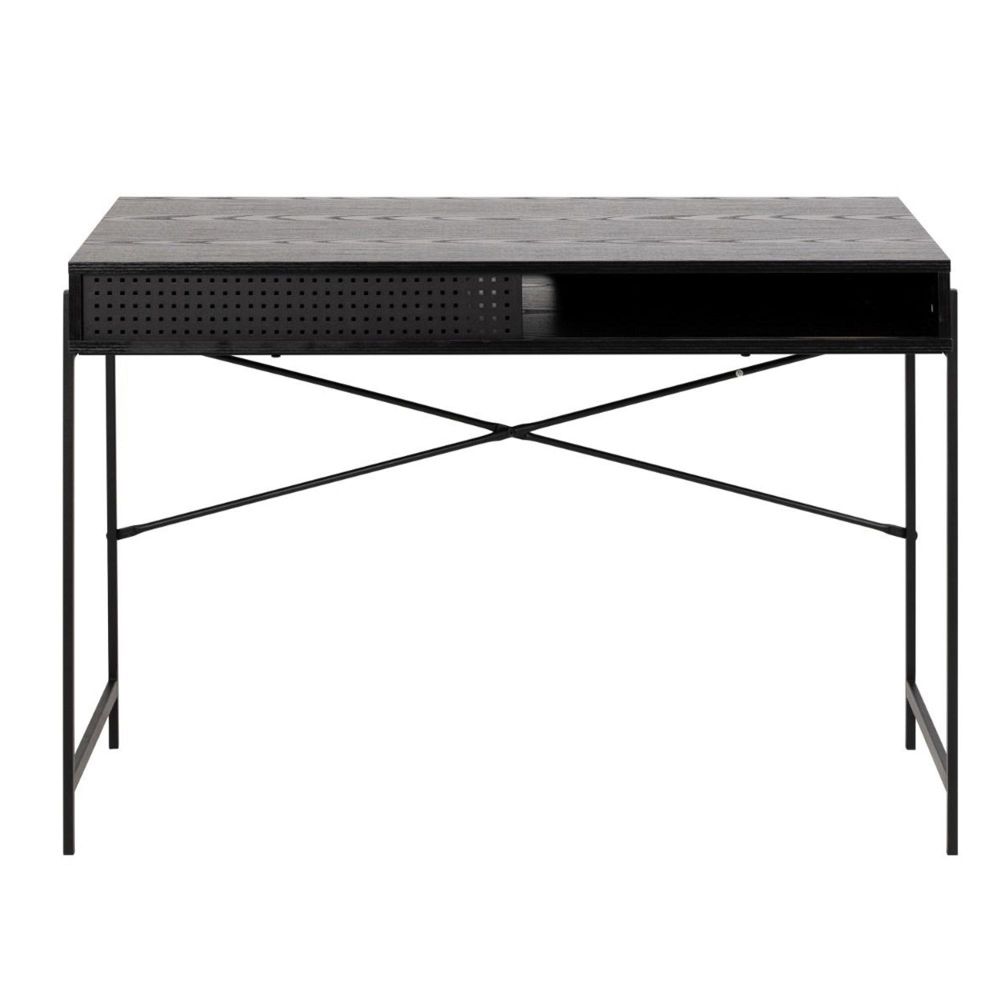 Item Code: 90A0000090079 Featuring clean lines and a sleek build, this desk is a minimalist addition suitable for any office or room. Sturdy powder-coated metal legs provide support to the Black ash tabletop, which offers easy cleaning. Utilize the sliding metal door underneath the table to conceal your papers and clutter, maintaining a tidy workspace.