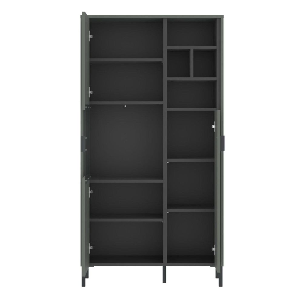 Item Code: 4W616741 Enhance your space with the Arundel Grey Green 2 Door Display Cabinet. Its chic grey-green and anthracite design, spacious shelves, and sleek glass doors blend modern elegance with practicality. Crafted from durable chipboard with high metal legs, it complements other Arundel Zielony pieces and suits any style, from modern to classic.