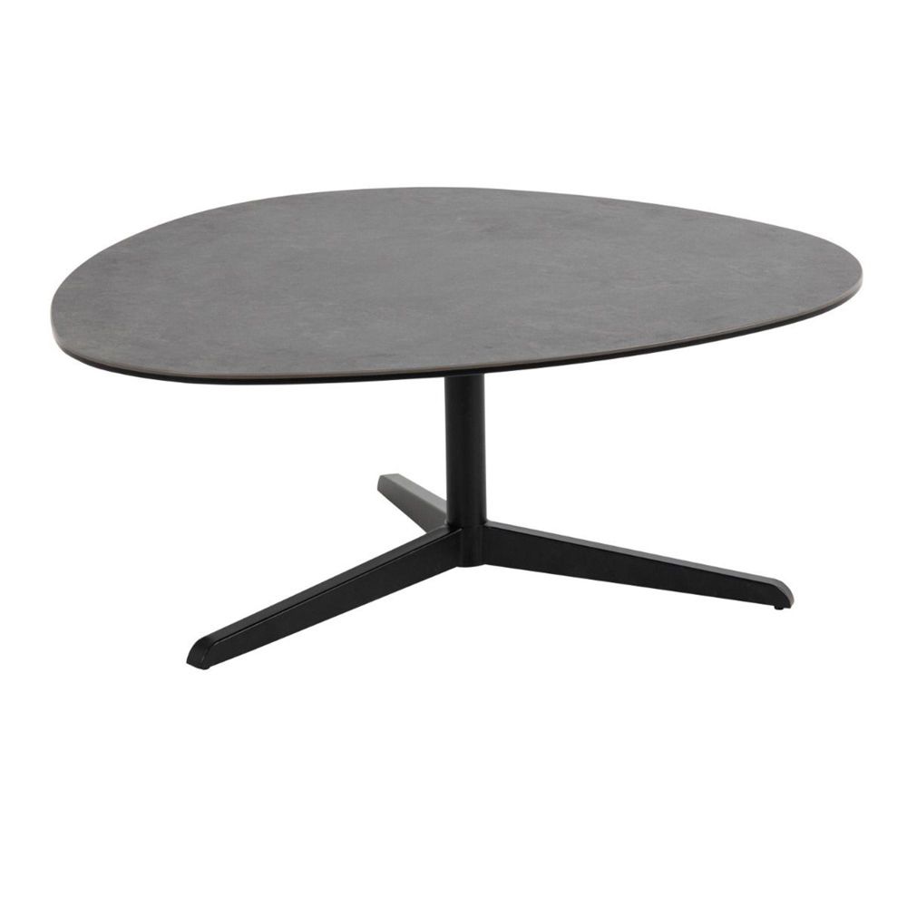 Item Code: 90AH000022098 Introducing a striking plectrum-shaped coffee table, adorned with a black Fairbanks rough ceramic top, elegantly poised on a three-star matt black steel base for a modern and chic addition to your living area.