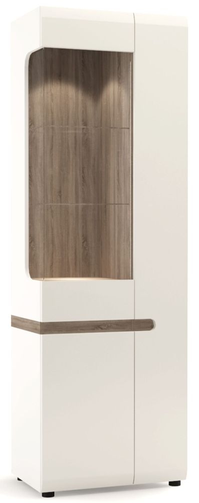 Item Code: 4020144P Chelsea Living Tall Glazed Narrow Display unit (RHD) in white with an Truffle Oak Trim. Unconventional design - a proposal for the followers of the latest trends. The clever mix of scratch resistant white melamine with beautiful high gloss fronts and oak melamine trim makes this top quality collection of furniture the ideal destination for the most modern of homes, the massive range that includes many cabinets and wall units fulfils every storage and display option.