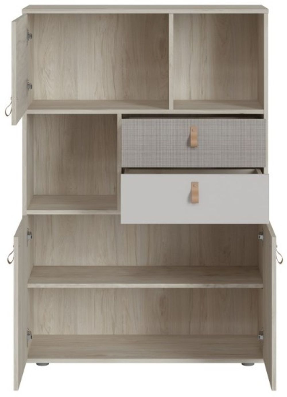 The attractive interior design is not only beautiful, carefully selected furniture and accessories. In a child's room, in addition to skilfully selected style and colors, functionality and the maximum use of the available space are important. Everything you expect from furniture for your child's room can be found in the Innes collection. A highboard with two drawers, shelves closed behind full fronts and open shelves combines exceptional capacity, functionality and a modern look. A large highboard does not have to seem too massive and heavy. The highboard from the Innes furniture collection is distinguished by a huge capacity, modern solutions, bright, universal and timeless colors and high quality of workmanship. A durable piece of furniture made of laminated chipboard in the shade of Rockford Walnut Light has subtly presented elements in the shade of Cashmere and Caroline. The whole is complemented by stylish leather handles. The highboard is equipped with drawer ball guides, ensuring full extension. The door has self-closing hinges. Highboard Innes is a durable piece of furniture that works well in everyday use. Its modern and timeless design allows it to be used in a children's room for many years. It is enough to change the style and color of accessories to match the room to the taste of a growing child. The furniture has space for displaying items on open shelves. Choose quality and style that will amaze you with their versatility and quality.