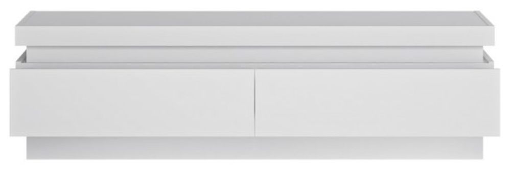 Generous 146cm wide TV cabinet, wide enough for the latest TV's. Plenty of storage in the easy gliding drawers. Includes a concealed lighting arrangement. The designers of this range have combined several rectangular shapes and produced a modern collection in 3 different colourways, Riviera light oak and white high gloss fronts, contrasting greys and white and gloss white.