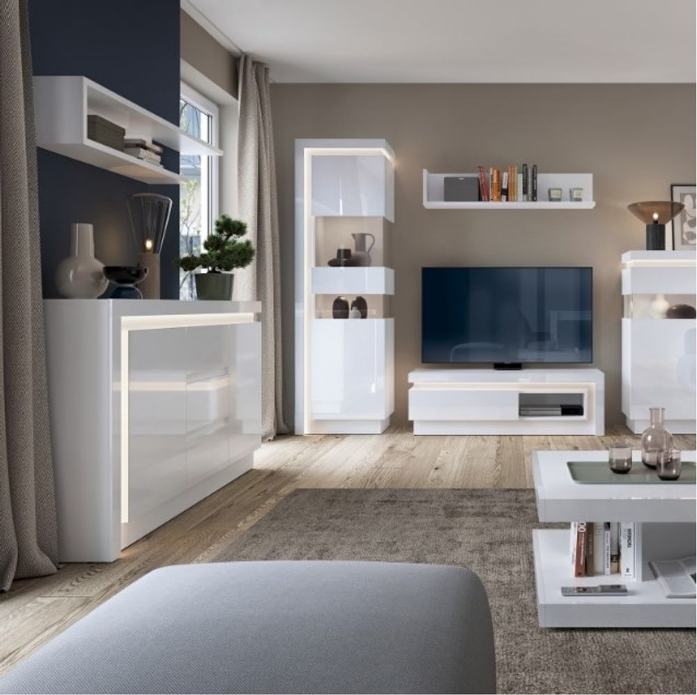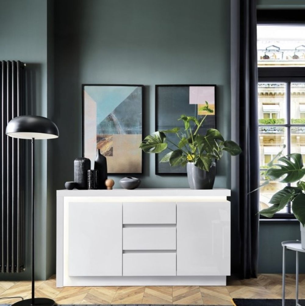 Lots of hidden storage space in this modern sideboard with 3 drawers and 2 cupboards with adjustable shelving. Includes a concealed lighting arrangement. The designers of this range have combined several rectangular shapes and produced a modern collection in 3 different colourways, Riviera light oak and white high gloss fronts, contrasting greys and white and gloss white.
