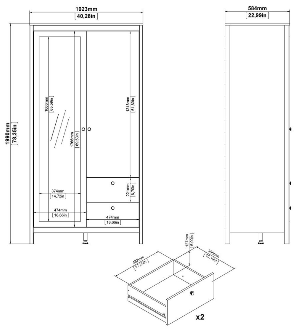 Madrid Wardrobe with 1 door + 1 mirror door + 2 drawers White