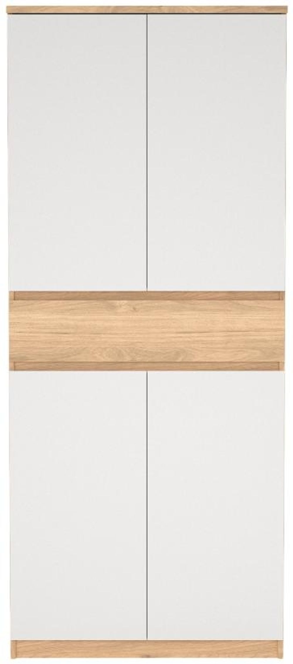 Introducing the Naia Shoe Cabinet: Style and Function in Perfect Harmony Discover the perfect storage solution for your beloved shoe collection with the Naia Shoe Cabinet. With its sleek design and clever functionality, this cabinet is designed to keep your shoes organized and your space clutter-free. Featuring four spacious doors and a convenient drawer, it effortlessly provides ample storage space for all your favourite pairs. The beautiful combination of Jackson Hickory Oak and White finishes adds a touch of elegance and versatility to elevate your home decor. Embrace organization and style with the Naia Shoe Cabinet, a perfect addition to your entryway or bedroom.