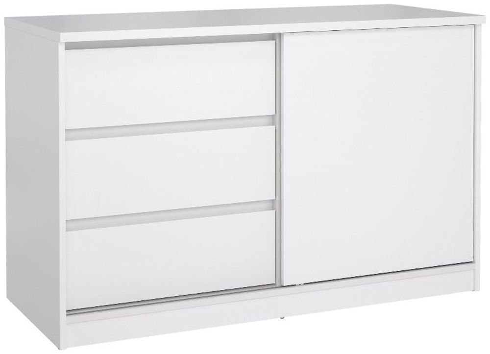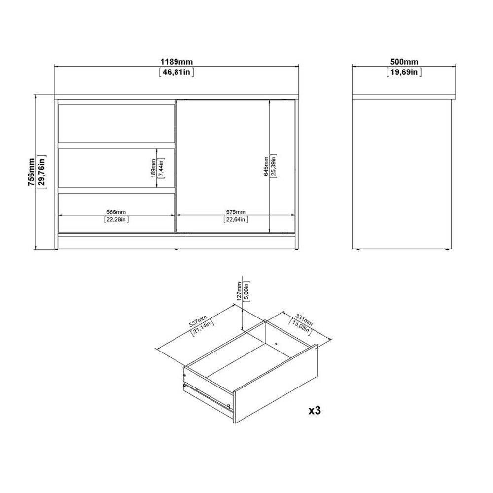 The Naia collection offers a tribute to timeless furniture. The storage unit has 3 drawers 1 shelve and a sliding door. Also available in Jackson Hickory Oak.