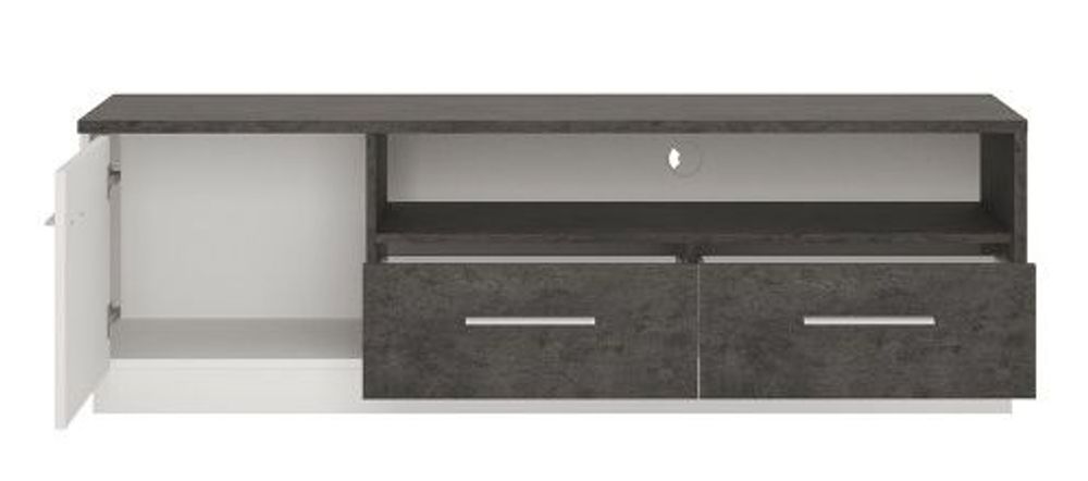 Item Code: 4335267 Gympie 1 door 2 drawer wide TV cabinet in Slate Grey and Alpine White. Taller, longer, and deeper than the 1 drawer model, this TV cabinet has more storage and a larger open shelf - a real feature piece that will look right at home holding whatever you need to fulfill all your entertainment needs!