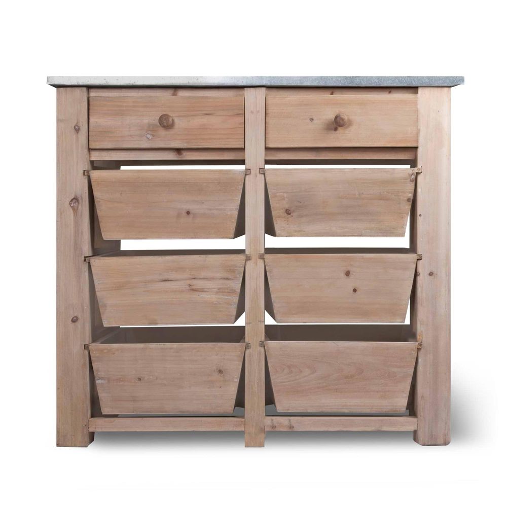 Item Code: ZTSU10 Providing indispensable contemporary storage, the Aldsworth 8 Drawer Storage Unit can be used throughout the home. This free-standing piece features six portable boxes and two standard drawers offering plenty of room to store a multitude of items.Crafted in Spruce with a thick galvanised sheet metal top, it's designed to be hardwearing and robust - as well as stylish. Use in the kitchen, potting shed or utility room to organise effortlessly. We've ensured our design takes into account the natural characteristics of the material, allowing for the smooth surfaces and wood grains to become prominent features.Crafted in Spruce with a Galvanised Sheet Metal top For indoor use only Fully-assembled Stained with a grey water stain, not chemically treated.