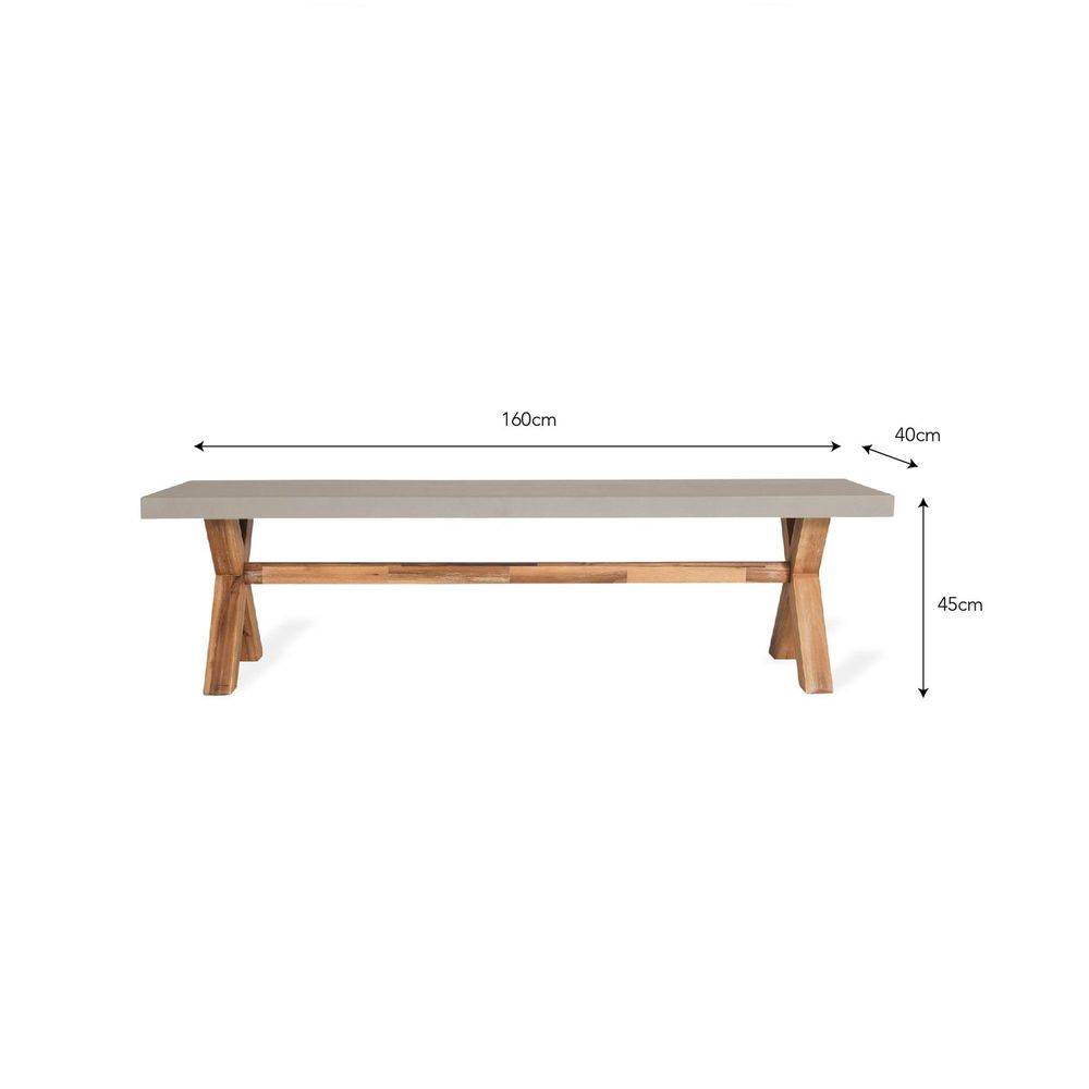 Made to match our stylishly contemporary Burford Dining Tables, the more compact version of our Burford Bench works equally well paired with our smaller sized table or as a standalone statement piece situated anywhere around the garden or home, where it looks particularly great running down the length of a hallway. When not being perched on, it doubles up as an attractive home for plant pots, decorative lanterns or coffee table books. Crafted from robust Polystone, the bench is weatherproof enough to stay outdoors all year round, though a protective covering will keep it looking its best in the face of wintry weather.Crafted in Polystone Legs are Acacia Wood Suitable for indoor and outdoor use Assembly required (instructions included) Weatherproof Product care: Polystone should be cleaned immediately if spills occur to avoid stains which are not covered by the warranty. Polystone is sensitive to acidic substances. Grease and dirt may also cause stains and damage the effect of the sealer. Placemats should be used with very hot or cold items to avoid condensation from prolonged exposure. Patina is to be expected due to the mix of natural materials If deep scratches occur, the Polystone will be exposed, in this case, a professional repair is recommended We recommend that all outdoor furniture is covered or stored under cover if left outside for long periods of time or during the winter months Polystone is made from natural materials so colour variances may occur If left in direct sunlight colour may fade Ensure that the furniture is completely dry before covering.