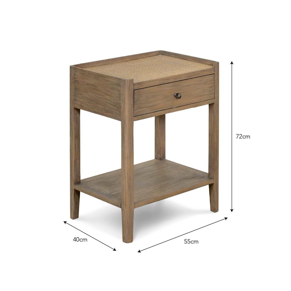 Item Code: CSTD03 The beautiful Chesterton Side Table with Drawer has a variety of potential uses around the home, bringing style and craftsmanship to any room. Use it as a bedside table next to the matching Chesterton King Bed, or top it with a statement lamp and place it alongside an armchair to use it as a side table in a living room or conservatory.This side table is crafted by hand in Indonesia using a technique that showcases the beautiful natural grain of the Bayur wood it's made from. Finished with a warm Mindi wood veneer, wooden drawer runners and gorgeous solid brass ring handles, it has a wicker rattan top that adds extra texture and aesthetic appeal. Pair with other furniture from our Chesterton collection to complete the room upgrade.Handmade in Indonesia from Bayur Wood with Mindi wood veneer. Wood is a natural material and natural colour variances may occur. Showcases natural wood grain and features a raised wicker rattan top detail which adds texture. Natural warm-wood finish. Solid brass ring handles. Drawer on wooden runners. White foot caps. Fully assembled. Max weight for each drawer: 3kg Max weight for table top: 21.5kg.Care InstructionsTo keep your furniture clean, we advise dusting regularly with a small brush or vacuum. Any spillages should be wiped clean with a damp cloth immediately in the direction of the grain. To preserve its condition and avoid fading over time, avoid exposing your furniture to direct sunlight. Discolouration may occur and cause the wood to crack. We recommend keeping your furniture away from heat sources like fireplaces or radiators - plus moisture - to prevent warping. Please do not drag the furniture, we recommend to always lift it to move, avoiding any breakages.