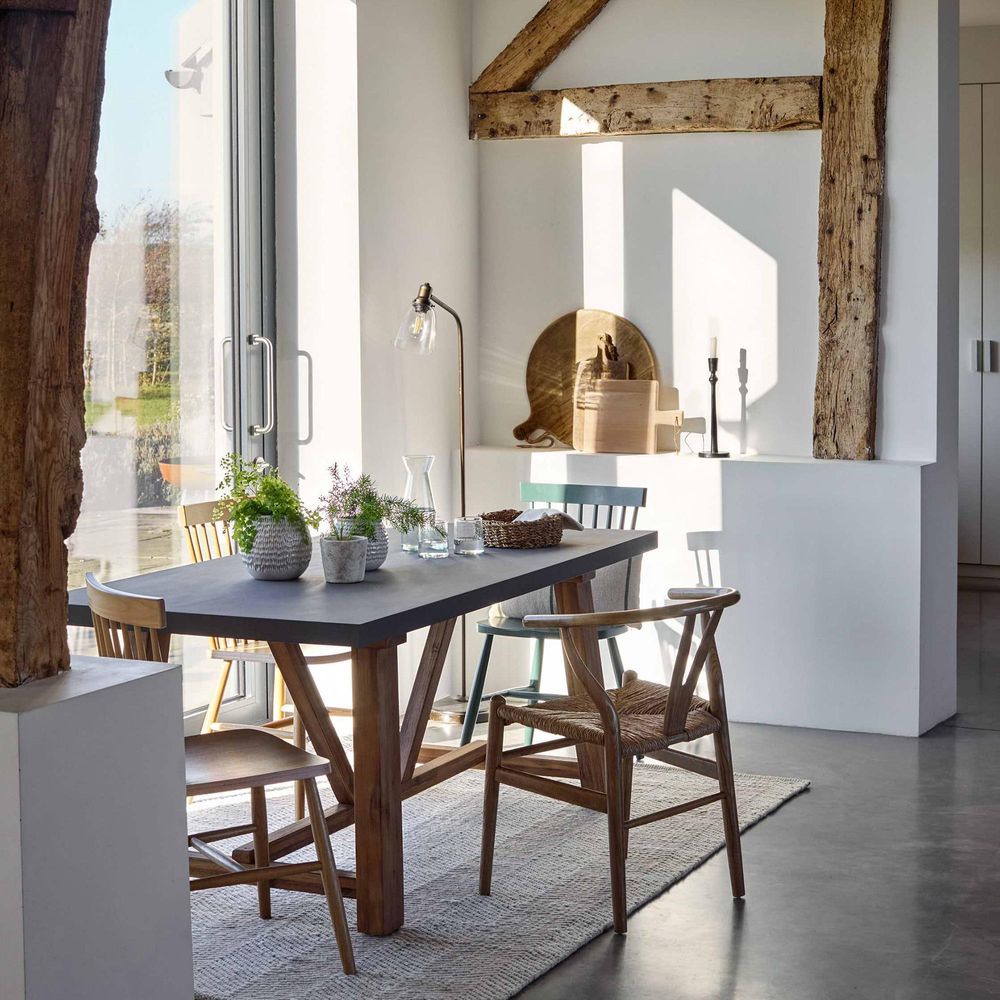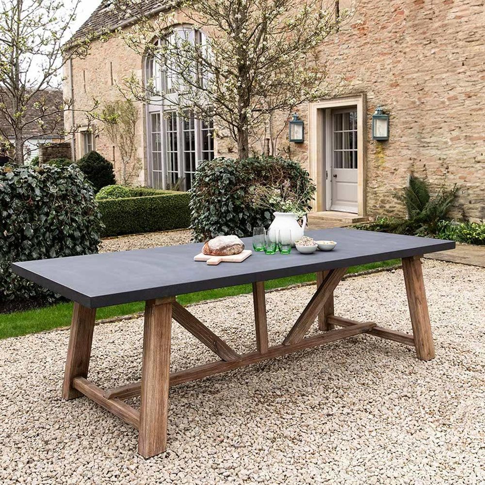 Item Code: LFCH71 A stylish and contemporary choice for outdoor or indoor gatherings, our trestle-inspired small Chilford Dining Table is equally at home styling a garden or dining room. Beautifully crafted from Grey Slate polystone with solid acacia legs, this 180cm version is perfect for smaller gardens and makes a striking patio focal point paired with our solid acacia Chilford Dining Chairs.Crafted from Acacia wood and Poly-Stone Table legs finished with protective footcaps To clean, wipe with a soft damp cloth Do not place hot or cold items directly on the surface, always use a protective mat Suitable for indoors and outdoors We recommend storing your furniture indoors or undercover during the winter months Polystone is made from natural materials so colour variances may occur Two person assembly advised If left in direct sunlight colour may fade.