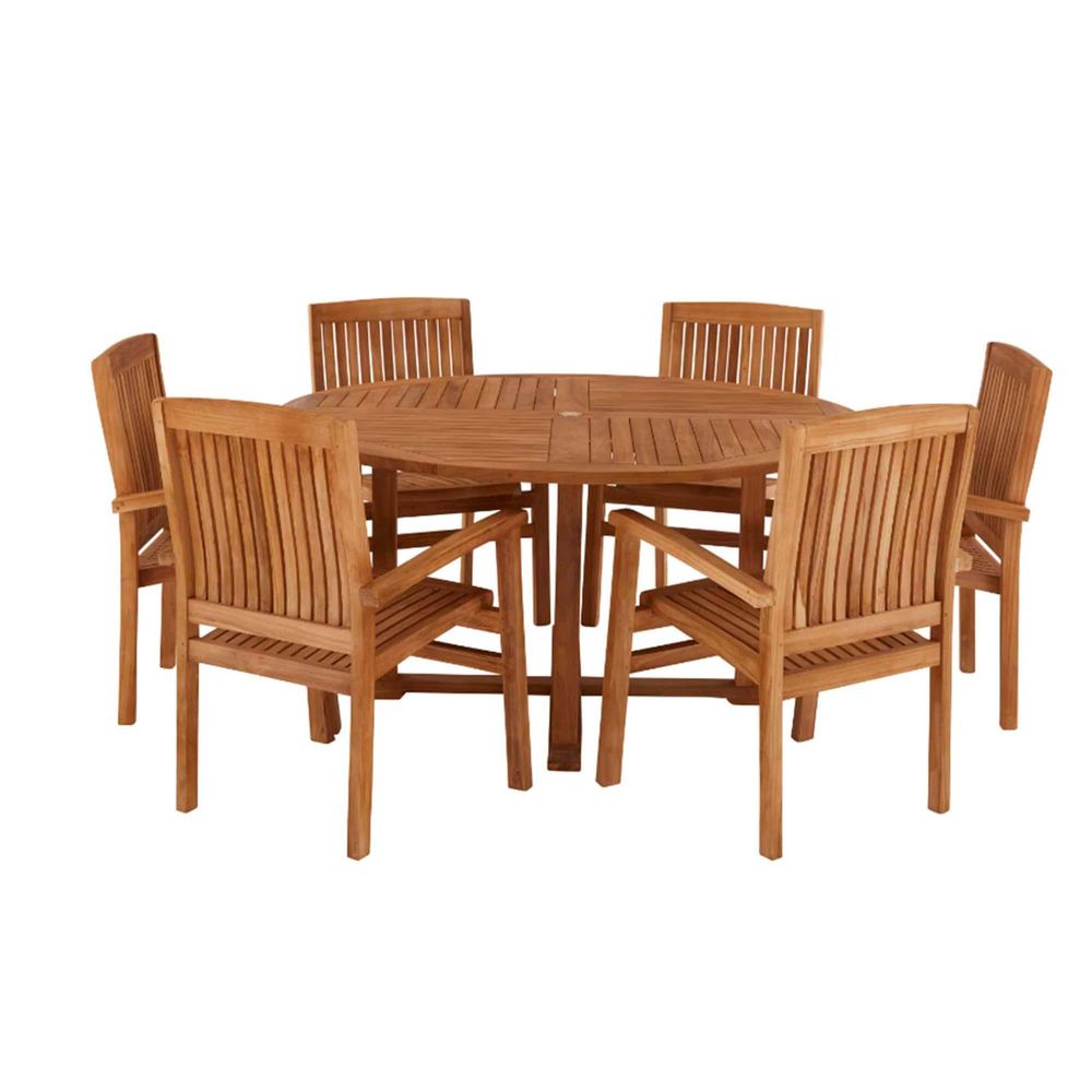 Made from solid teak, our robust, round, 6 seater Churn Round Table is perfect for enjoying all year round alfresco dining in your outdoor space. This set comes complete with 6 Henley Stacking Armchairs. Our round solid teak 6 seater table has a diameter of 160cm so you can easily seat 6 people around its circumference, and is ideal for gardens, terraces, pubs and restaurants. The 6 Henley Solid Teak Stacking Armchairs are handmade from solid natural teak. Purposely designed to be stacked, the Henley allows you to stack up to 6 individual chairs (without supports) on top of themselves in order to save space and aid storage when not in use. With supports, it is possible to stack even higher! The Henley Armchair offers reliability and low maintenance coupled with the benefit of being handcrafted from durable timber, meaning your chairs should last you for years to come.Crafted from high quality solid teak Features a multi-slatted seat and back rest, with ergonomic armrests Stacking design; ideal for storage and space saving Ethically sourced FLEGT Licenced timber Constructed from hardwearing timber Can be left outside all-year round.