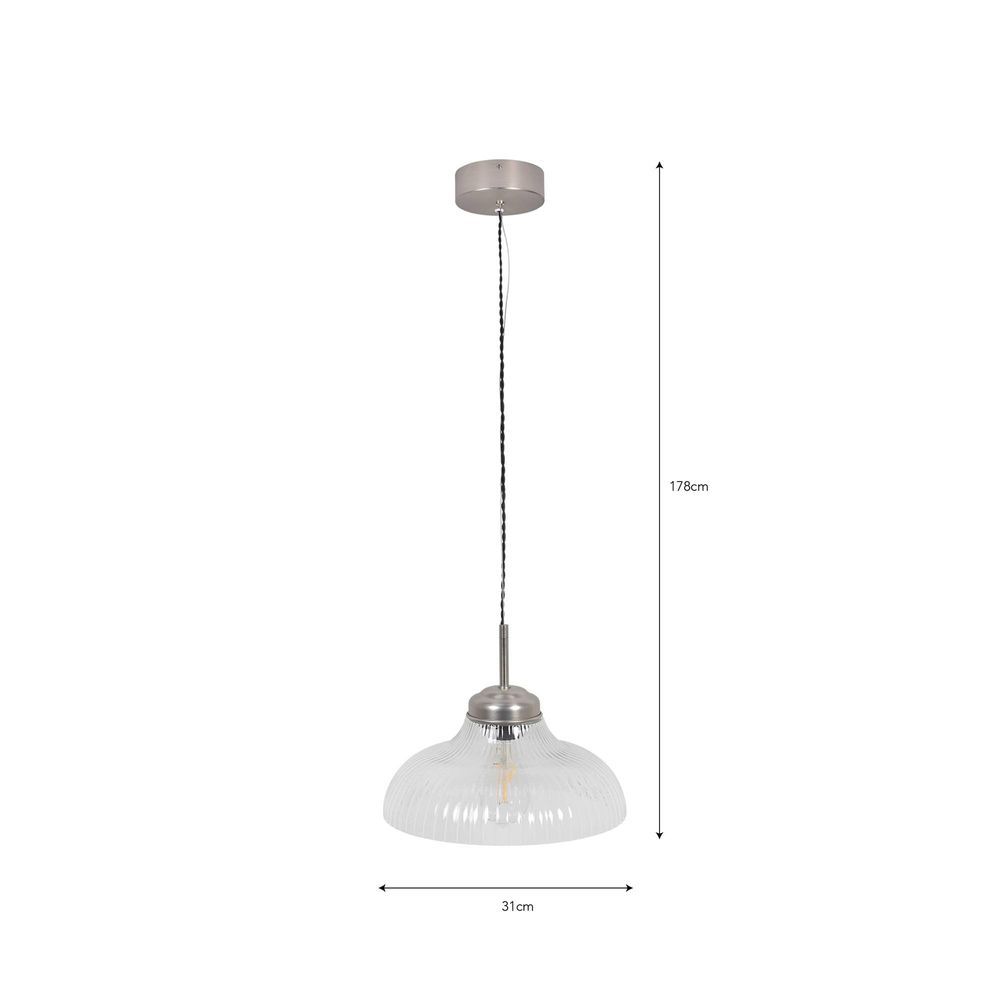 Item Code: FFO105 Crafted from hand-blown glass, our Fovant Glass Pendant Light is a slightly scaled down version of its larger sibling, but with a curved rather than domed neck shape. Finished with satin nickel coated steel fixings, this vintage-inspired pendant light has a sophisticated ribbed detail and would look stunning placed over a dining table or kitchen island.IP20 Class I Recommended bulb: x1 E27 LED Max 10W (not included) Shade height: 14cm Shade diameter: 30cm Cable length: 160cm Material: Aluminium, Glass and Steel.