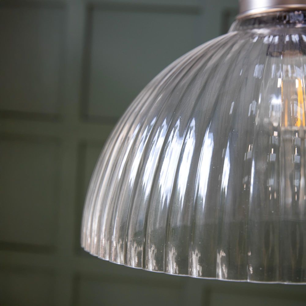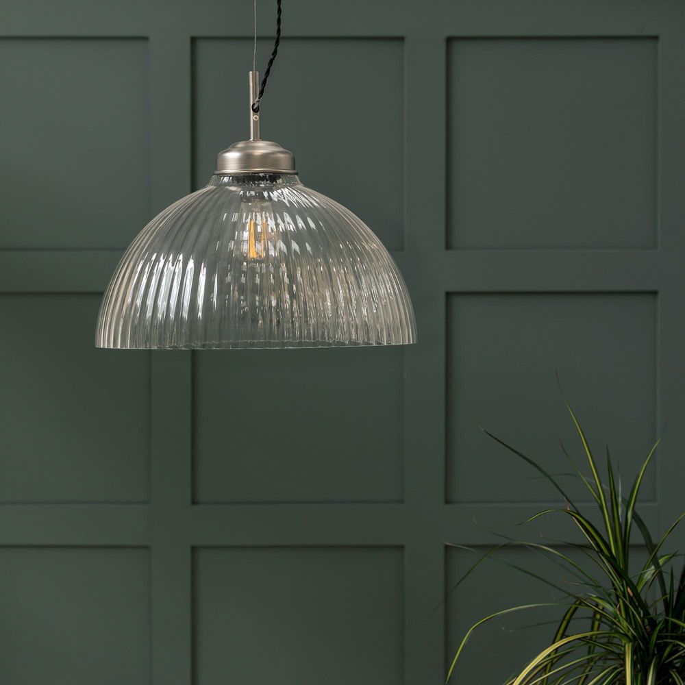 Item Code: FFO240 With its retro vibe and chic ribbed detailing, our Fovant Glass Pendant Light wouldn't??t look out of place in a Parisian brasserie. With a stunning 38cm dome-shaped shade, this statement ceiling light will cast an impressive orb of light over a large dining table or kitchen island, as well as making a striking first impression in a hallway. Its crafted from hand-blown glass with satin nickel coated steel fixings.IP20 Class I Recommended bulb type: x1 E27 LED Max 10W (not included) Shade height: 30cm Shade diameter: 36cm Cable length: 180cm Material: Aluminium, glass, steel. Cord is adjustable in length, we recommend you use a qualified electrician to do this.