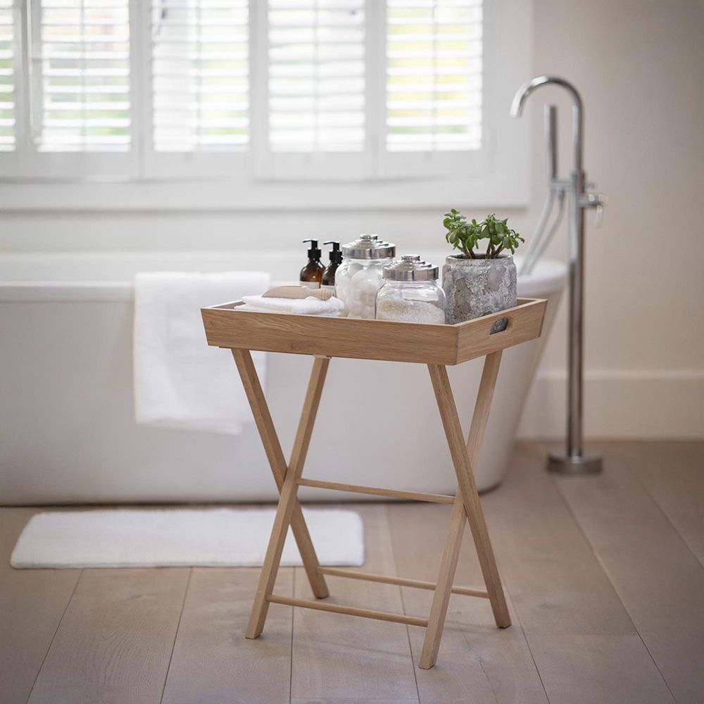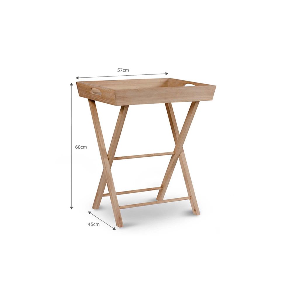 Item Code: TRWO06 Crafted in Oak the Hambledon Butlers Tray offers versatile and stylish storage for use throughout the home. The practical and portable side table has a removable tray and foldable legs allowing it to move moved or stored away with ease.The responsibly sourced material has been lightly oiled to protect the natural finish and prevent staining. The tray features cut out holes at either end to fully detach to transport and serve effortlessly. The timeless style also lends itself for use as a console or side table placed in a hallway,bedroom or living room.Crafted in Oak Tray: Base is oak veneer, Sides are solid oak Legs: Natural Solid Oak For indoor use only Fully-assembled Tray slots onto legs Legs are foldable Strap is glued to wooden rail.