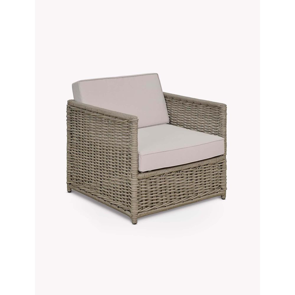 Style up a patio or terrace ready for summer with our Harting Armchair. Supremely stylish and comfortable in equal measure, this armchair is a must for creating an outdoor living space ready for relaxing and entertaining in the warmer months. Its neutral cushion fabric will complement the earthy tones of the garden and patio paving stones.The frame of this classy armchair is woven from sturdy PE rattan, a long-lasting synthetic material in a stone-coloured weave that has the appearance of natural rattan, with minor colour variations that add character. The weatherproof frame is UV and mould-resistant and can be left outdoors throughout the year, while the shower-proof cushions just need bringing in during harsh weather and over the winter months. Protect this brilliant armchair from bad weather with the matching, made-to-fit Harting Armchair Cover, and pop the cushions in the Skala Outdoor Storage Box.Handwoven, durable PE rattan - a synthetic material that built to last; its natural, stone coloured weave resembles natural rattan, with some colour variations present throughout the material. Weatherproof, UV and mould resistant. Fully assembled. Fabric composition: Polyester. Wash instructions: hand wash only. Seat height: 47cm Cushion thickness: 12cm Linen-look cushions are showerproof. In harsh weathers or during the winter months, remove cushions from the frame and store in a dry place. We recommend that all outdoor furniture is covered or stored under cover if left outside for long periods of time or during the winter months - Recommend to purchase our made to fit Harting cover. Ensure that the furniture is completely dry before covering.