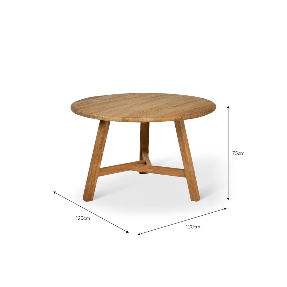 Item Code: HRDT02 Our stylish and sustainable Hawthorne Round Dining Table is one with a story to tell. The beautiful reclaimed teak wood it?s made from comes from Indonesia, where it?s handcrafted from timber taken from framework, columns and pillars in old homes. Traces of its former life may be visible in the woodwork, adding heaps of character and a sense of history to this gorgeous piece. Reclaimed teak wood is famed for its top quality, as it?s stronger than new teak. This table has a rustic and naturally textured finish, with imperfections that add to its charm, beauty and individuality. It will comfortably seat four to six people, so just add our Hawthorne Stools and the heart of your home is ready for family meals for decades to come.Please note that this product is made from Teak wood. Wood is a natural material and colour variance may occur. Handmade in Indonesia from reclaimed teak wood. Timber taken from framework, columns or pillers in Indonesian old homes. Natural and recycled material. Rustic, natural textured finish. Each piece will be unique and imperfection adds to the beauty. Traces of the wood's past life may be visible - holes showing traces of nails, wood filler or a past wood joint. Indoor use only. Table top 4cm thick. 120cm dining table - seats 4-6 comfortably. Fully assembled. Has black plastic feet on legs. Max weight: 350-450kgs.