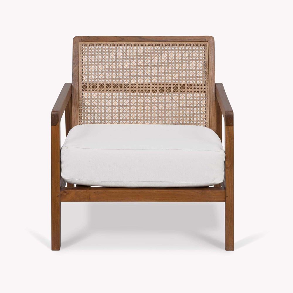 Our Lambourne Rattan Armchair is distinguished by its timeless design, which is carefully crafted from top-quality teak wood with a rustic rattan back. The perfect choice for a plant-filled conservatory, garden room or summer house, it would also be a stylish and sustainable addition to a living room, the corner of a dining room or even a thoughtfully curated landing or bedroom space.The Lambourne??s luxuriously deep seat cushion is one you can really sink into, making it a supremely comfy place to curl up with a good book. The seat cushion is removable, as is its cover, making it easy to keep clean. Place it alongside a Rowley Coffee Table to conjure up a cosy space anywhere around the home.Teak Frame - Teak Oil. Natural Rattan back. Indoor use only. Cushion: 100% Olefin. Black foot pads on each leg. Fully assembled. Spot clean only with gentle detergent. Removable cushion cover.Care instructions for the above Rattan Armchair are as follows:1. To clean, gently wipe with a lint free cleaning cloth immediately, in the direction of the grain to maintain the appearance of the lacquered wood. 2. Never drag furniture - always lift it.