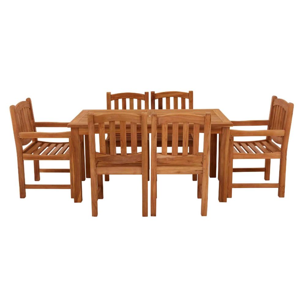 Constructed from solid teak, our Marbrook Table 150cm x 75cm is perfect for enjoying all year round alfresco dining in your outdoor space. Your dining set will come complete with 4 Grisdale Side Chairs and 2 Grisdale Carver Chairs. The Marbrook Teak Table 150cm x 75cm is rectangular in shape so you can comfortably seat 6 people around it making it a fine choice for the modern-day family or hosting small gatherings. A convenient built-in opening for a parasol is standard on the table and comes supplied with lovely brass fittings which finish the table perfectly when not in use. The 4 Grisdale Solid Teak Side Chairs are handmade from solid natural teak. Featuring a slatted seat and back rest, the Grisdale provides a seat which is not your average garden chair. The 2 Grisdale Carver Chairs are handmade from solid natural teak. Featuring an ergonomic curved armrest, slatted seat and back rest provides a seat which is not your average garden chair. The thick, heavy teak is constructed in way that offers reliability and low maintenance coupled with the benefit of being handcrafted from durable timber, meaning your chairs should last you for years to come.Comfortably seats 6 people. Robust 2.8cm thick table top with timeless slatted inlay. Made from high quality teak. Ethically sourced timber. All dovetail, mortice and tenon joints are dowelled for additional strength. Constructed from hardwearing timber. Can be left outside all-year round. Incorporated parasol hole with stylish brass fitting sleeve and cap. A multi-slatted seat and back rest, with ergonomic armrests to provide the perfect place to sit back and relax. Due to the handmade nature of our furniture, please allow for measurement tolerances.