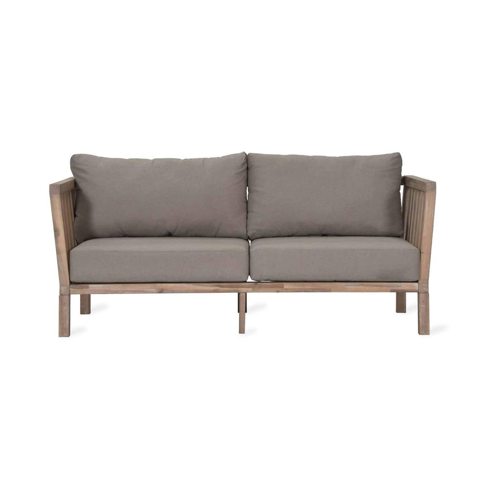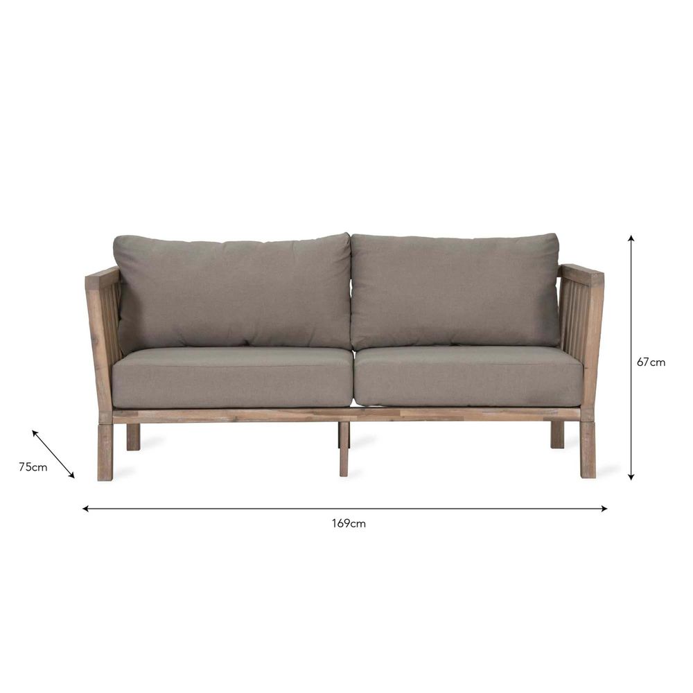 Item Code: FUAC03 Whitewash acacia wood complemented with soft grey cushions makes the Porthallow the most traditional of our outdoor furniture collections. This 2-Seater is perfect for smaller patios and pathways or why not style two together with the Rectangular Coffee Table and create a cosy outdoor retreat.Back legsH67cm x W4.5cm x D4.5cmFront legs:H64cm x W4.5cm x D4.5cmuitable for indoor and outdoor use Fully-assembled Crafted in Acacia Wood Weatherproof Oak wash oiled finish Cushions are Polyester Cushions are showerproof Cushion covers are removable and washable at <30C In harsh weathers or during the winter months, remove cushions from the frame and store in a dry place We recommend that all outdoor furniture is covered or stored under cover if left outside for long periods of time or during the winter months Ensure that the furniture is completely dry before covering.