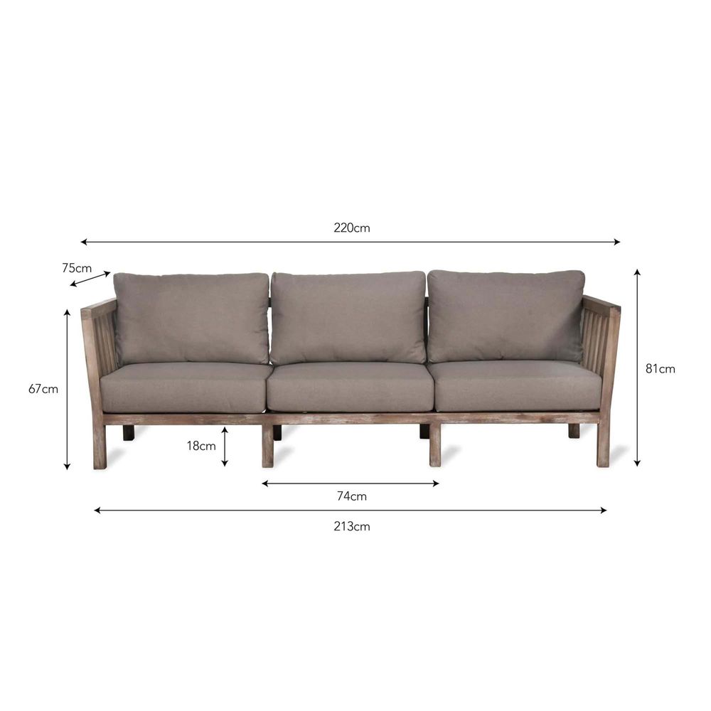 Item Code: FUAC15 Enjoy sophisticated outdoor lounging with the Porthallow 3-Seater Sofa. Designed to sit stylishly in all manner of garden styles, the whitewash acacia wood and accompanying grey cushions make for an uplifting addition to outdoor spaces. Perfect for an addition to patio spaces alongside the Porthallow Rectangular Coffee Table, or a couple of Armchairs.uitable for indoor and outdoor use Fully-assembled Crafted in Acacia Wood Weatherproof Oak wash oiled finish Cushions are Polyester Cushions are showerproof Cushion covers are removable and washable at <30C In harsh weathers or during the winter months, remove cushions from the frame and store in a dry place We recommend that all outdoor furniture is covered or stored under cover if left outside for long periods of time or during the winter months Ensure that the furniture is completely dry before covering.