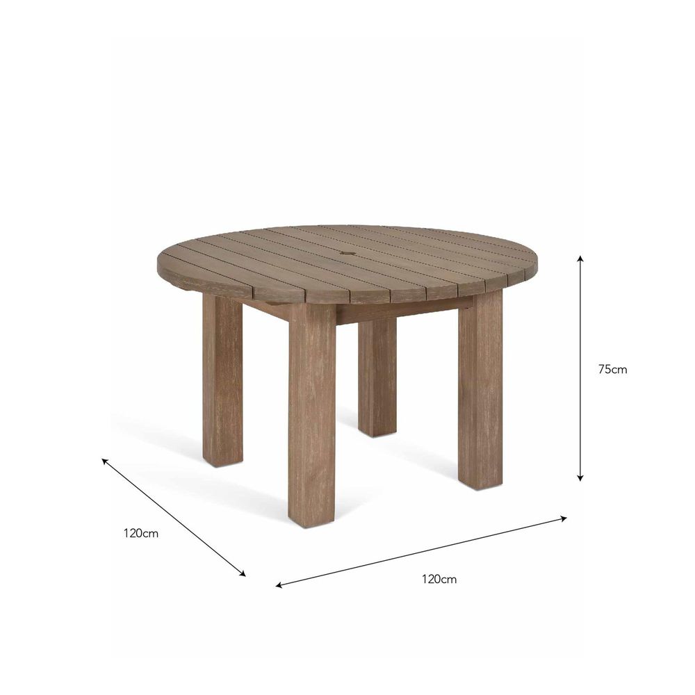 Item Code: LFPO58 Create a cosy outdoor seating and dining area with our Porthallow Round Dining Table. Crafted from solid acacia, this medium-sized version is ideal for patios and decking areas and makes the ideal table for al fresco gatherings all summer long. Equally suited to stylish garden parties or informal family barbecues, it's a versatile piece that transforms a garden into an outdoor entertainment space.This dining table perfectly matches our Porthallow Dining Chairs, and will comfortably fit four around it. It's robust and weatherproof to live outdoors all year round, but we do recommend a protective covering to keep it in great condition in the depths of winter Slat width9.6cmMeasurement between the slats:0.40cmDiameter of hole in centre5.5cmTable top thickness4cmCrafted from FSC Acacia wood 2 person assembly No power tools to be used on assembly.