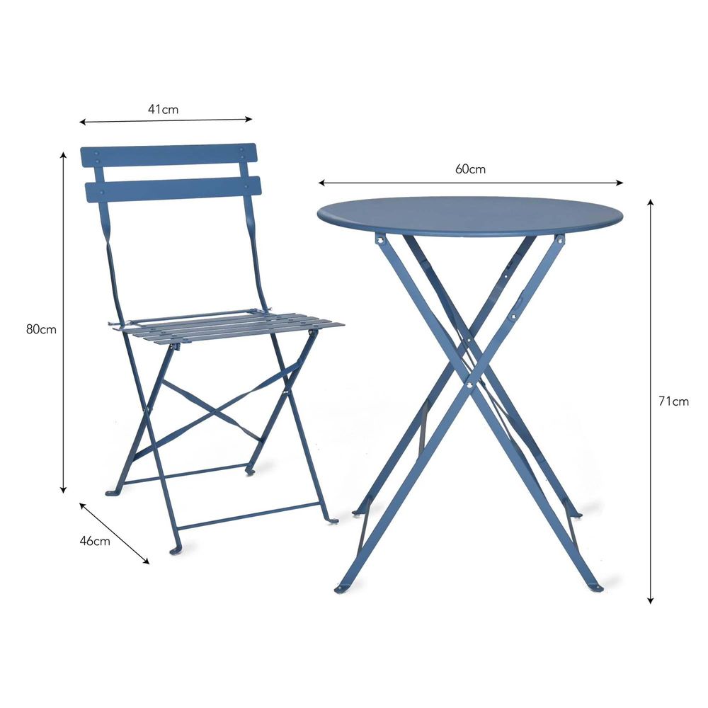 Item Code: RDLB01 Our classic French inspired Rive Droite Bistro Set is designed for any sized space, from courtyards to patios and balconies. Fully foldable and available in a wide choice of colours, you can go simple and neutral or bright and bold. Great for that first cup of tea or spot of lunch, why not use indoors too in the conservatory or kitchen.Crafted in Powder Coated Steel Fully assembled Suitable for indoor and outdoor use Weatherproof Set folds flat for easy storage Weight limit: Chair 120kg, Table 40kg We recommend that all outdoor furniture is covered or stored under cover if left outside for long periods of time or during the winter months Please note that outdoor furniture pieces may be susceptible to rust when exposed to coastal environments Ensure that the furniture is completely dry before covering.