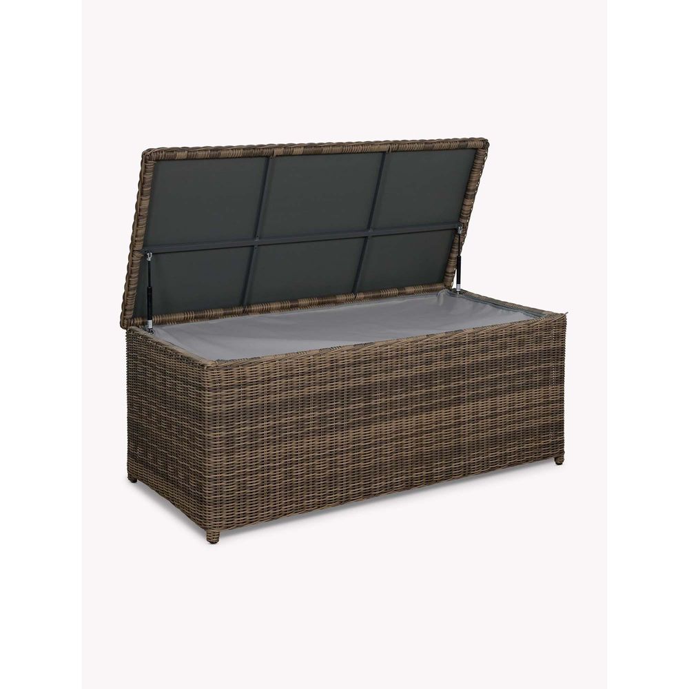 The stylish way to store outdoor furniture cushions and other garden goods, our dark rattan Skala Outdoor Storage Box keeps everything safe and dry whatever the weather. Its robust, elegantly curved aluminium frame is handwoven with hard-wearing poly rattan - a durable, weatherproof and UV and mould-resistant synthetic material that closely resembles natural rattan (even down to the small colour variations!). It's lined with a zipped, showerproof grey fabric that keeps the things inside dry, and a gas strut soft-close lid prevents slamming.Designed for outdoor use. Made from handwoven, durable PE rattan - a synthetic material that built to last. Some colour variations present throughout the material. Slightly curved at the edges. Weatherproof, UV and mould resistant. Aluminium frame. Fully assembled. Gas strut soft close lid which comes fully lined with a zip, in a showerproof grey fabric to protect the inner contents.