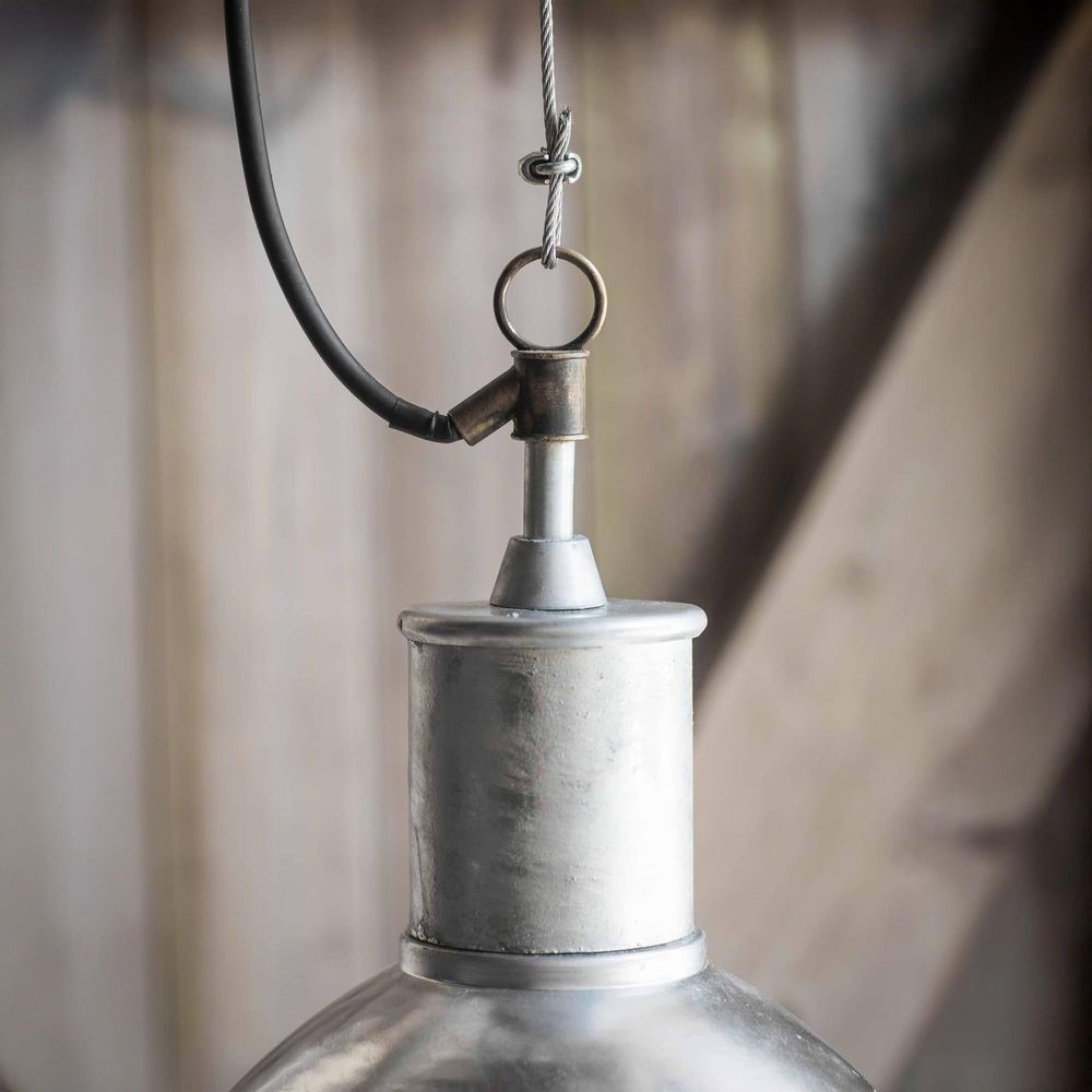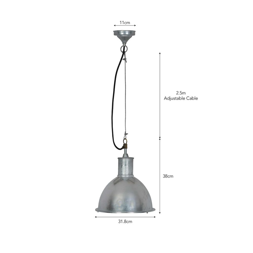 Item Code: LAHP40 With its large domed shape the St Ives Bay Outdoor Pendant is ideal for use on outside terraces, gazebos and pergolas. Spun in Galvanised Steel, it's dipped in molten zinc during production to create the rustic Hot Dipped Galvanised finish. We've added a raw cast Brass connector which holds the 2.5 metre adjustable cables.Taking its name from commercial High Bay lighting it's perfect for adding an industrial element to outdoor entertainment areas. Designed with an E27 fitting, the shade base includes a flat diffuser that seals the light and offers a dispersed glow. The pendant is IP44 rated making it perfect for bathroom use also.Please note that due to export restrictions we are not currently able to deliver this product to mainland Europe.Crafted in Hot Dipped Galvanised Steel and Brass Cable: Black Tubing and Wire Matching ceiling rose Weatherproof, including coastal locations IP44 rated for outdoor and bathroom use Class 1 Construction (Earthed) Motion-sensor compatible (not supplied) Requires 1x E27 bulb (not included) Max wattage: LED 10W If fitting onto a narrow beam (smaller than the diameter of the ceiling rose) either use a blanking plate or seal the ceiling rose with silicone. This will ensure the fitting stays watertight.