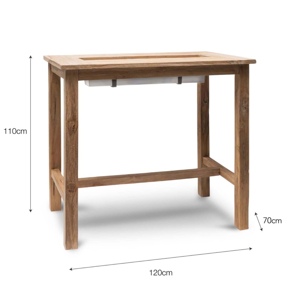 Item Code: FUTE09 The perfect option for summer entertaining our range of St Mawes Drinks/Planter Bar Tables are ideal for gardens of all sizes. Crafted in weatherproof Teak each comes complete with a Galvanised Steel trough, that can be filled with ice and drinks or flowers for a lovely display.Offering exquisite style, it can be positioned on a patio, decking or in a courtyard for afternoons spent relaxing outdoors. The central tray is removable, and the table comes with a separate teak slat to cover the trough when not in use.The Reclaimed Teak material has been carefully selected by hand, kiln-dried, waxed, polished and bottle rubbed to allow the organic oils to add a layer of natural protection to the table. We would recommend applying a Teak Cleaner, Shield or Oil every summer to help prolong its life.Crafted in Teak Trough is crafted in Galvanised Steel Weatherproof Assembly required (instructions included) Each piece is carefully selected by hand and natural flaws are a characteristic of this material Naturally over time the Teak will turn a soft grey colour We recommend that all outdoor furniture is covered or stored under cover if left outside for long periods of time or during the winter months Ensure that the furniture is completely dry before covering.