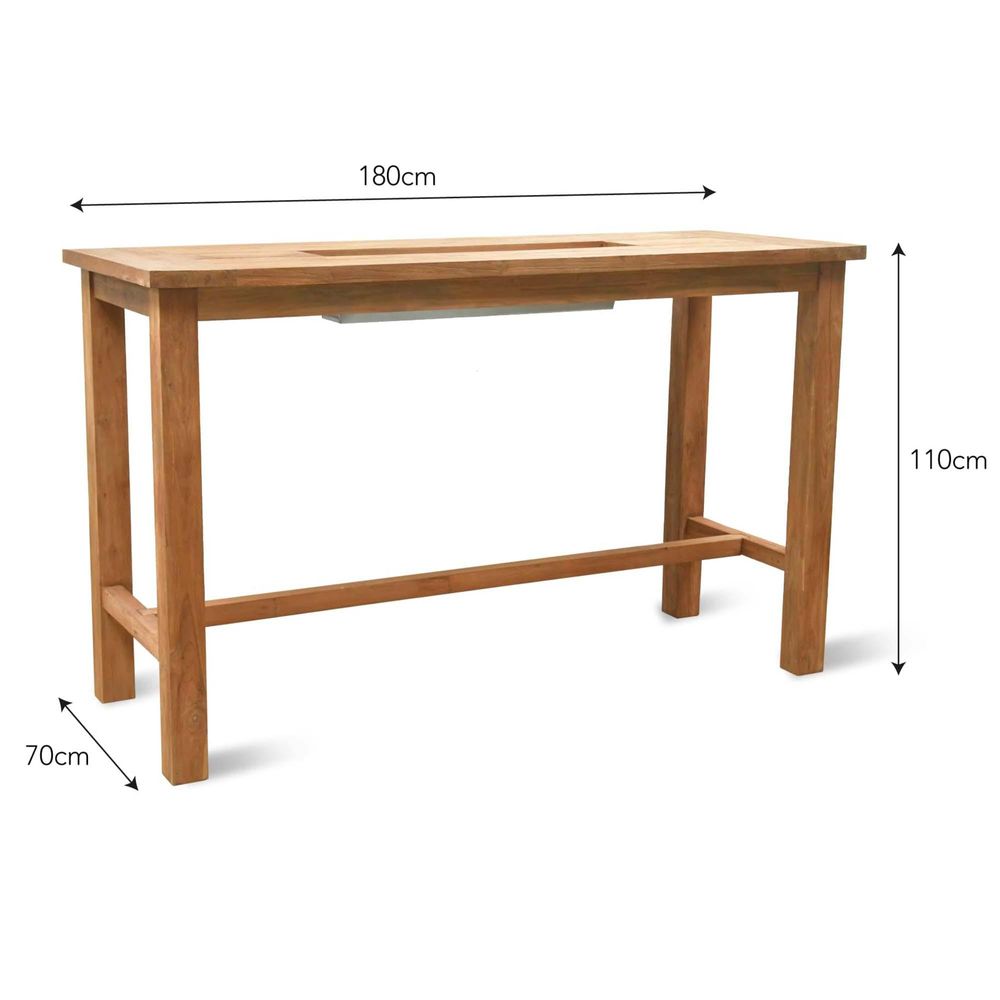 Item Code: FUTE22 The perfect option for summer entertaining our range of St Mawes Drinks/Planter Bar Tables are ideal for gardens of all sizes. Crafted in weatherproof Teak each comes complete with a Galvanised Steel trough, that can be filled with ice and drinks or flowers for a lovely display.Offering exquisite style, it can be positioned on a patio, decking or in a courtyard for afternoons spent relaxing outdoors. The central tray is removable, and the table comes with a separate teak slat to cover the trough when not in use.The Teak material has been carefully selected by hand, kiln-dried, waxed, polished and bottle rubbed to allow the organic oils to add a layer of natural protection to the table. We would recommend applying a Teak Cleaner, Shield or Oil every summer to help prolong its life.Crafted in Teak Trough is crafted in Galvanised Steel Weatherproof Assembly required (instructions included) Each piece is carefully selected by hand and natural flaws are a characteristic of this material Naturally over time the Teak will turn a soft grey colour We recommend that all outdoor furniture is covered or stored under cover if left outside for long periods of time or during the winter months Ensure that the furniture is completely dry before covering.
