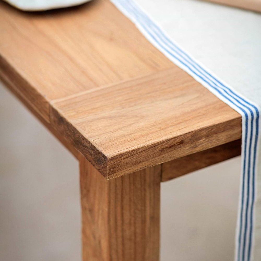 A welcome addition to our stunning St Mawes range, this beautiful dining table is one to gather around in the garden all summer long. Equally suited to a dining room or kitchen, it's crafted by hand from reclaimed teak wood in Indonesia and has natural quirks that make each one unique and characterful.This table comfortably seats six people, with our matching St Mawes Dining Chairs a great choice to go around it. Its rich brown colour will naturally evolve to a soft grey over time, and we recommend treating it regularly with teak oil to protect, feed and nourish the wood. Though this table is weatherproof, we recommend covering it or storing it under cover if it's left outside for long periods of time and over the winter months.Care & MaintenanceDo not put hot items directly on the furniture surface. Do not clean furniture with harsh cleaners or polish. Do not place furniture in direct sunlight. Do not place furniture near heating or cooling vents. Do not write on furniture without a padded barier to protect the surface. Not for commercial use, for residential use only. Dust and pick up spills using a clean, non-coloured, lint-free cloth. Stains may be removed with mild soap solution and damp cloth.
