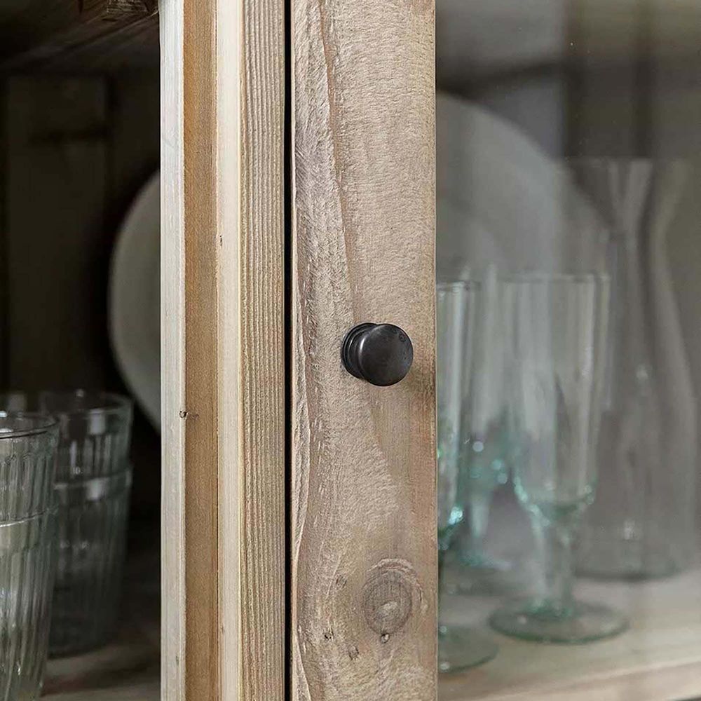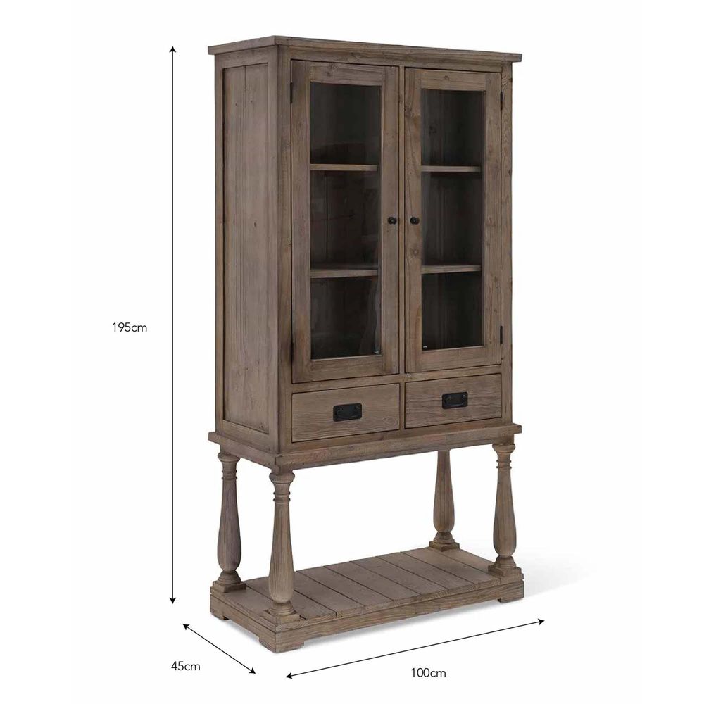 Item Code: CFTO294 Our attractive Topsham Glass Display Unit is the perfect place to store glassware and other tableware in an aesthetically pleasing way. Made from reclaimed pine with dark handles and tempered glass, it keeps your glasses safely housed while making them into a feature in the dining room, kitchen or lounge.This unit features a glass-doored upper cupboard with three shelves, with two drawers below it that make an ideal place to store cutlery. Beneath, a handy open shelf is ideal for storing board games, baskets and other bits and pieces. An anti-tip kit included with this unit keeps it safely upright, and it pairs perfectly with other furniture from our Topsham range for a unified look.Maximum weight limit shelves can hold: 20kg Crafted from reclaimed Pine and tempered glass Fully assembled Anti Tip kit included Drawers on wooden runners with wooden stoppers Drawers have Antique Brass Monarch handles.