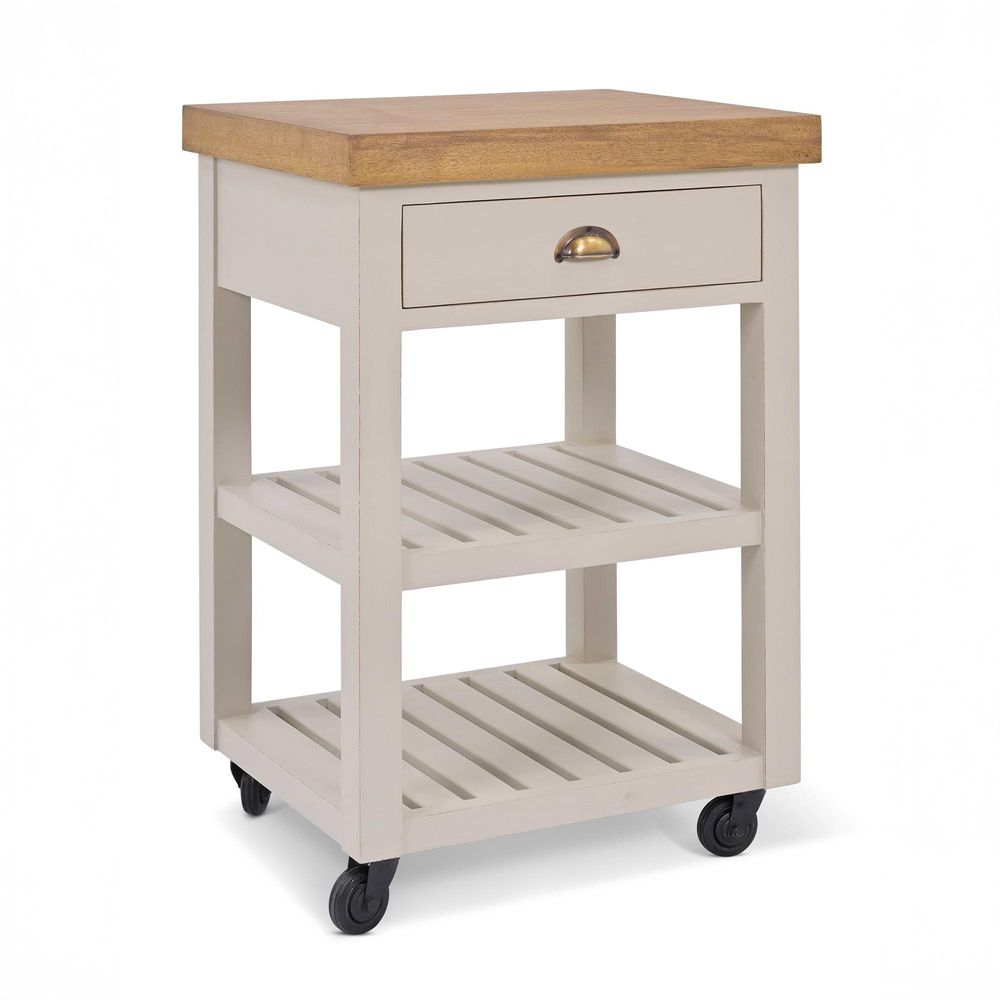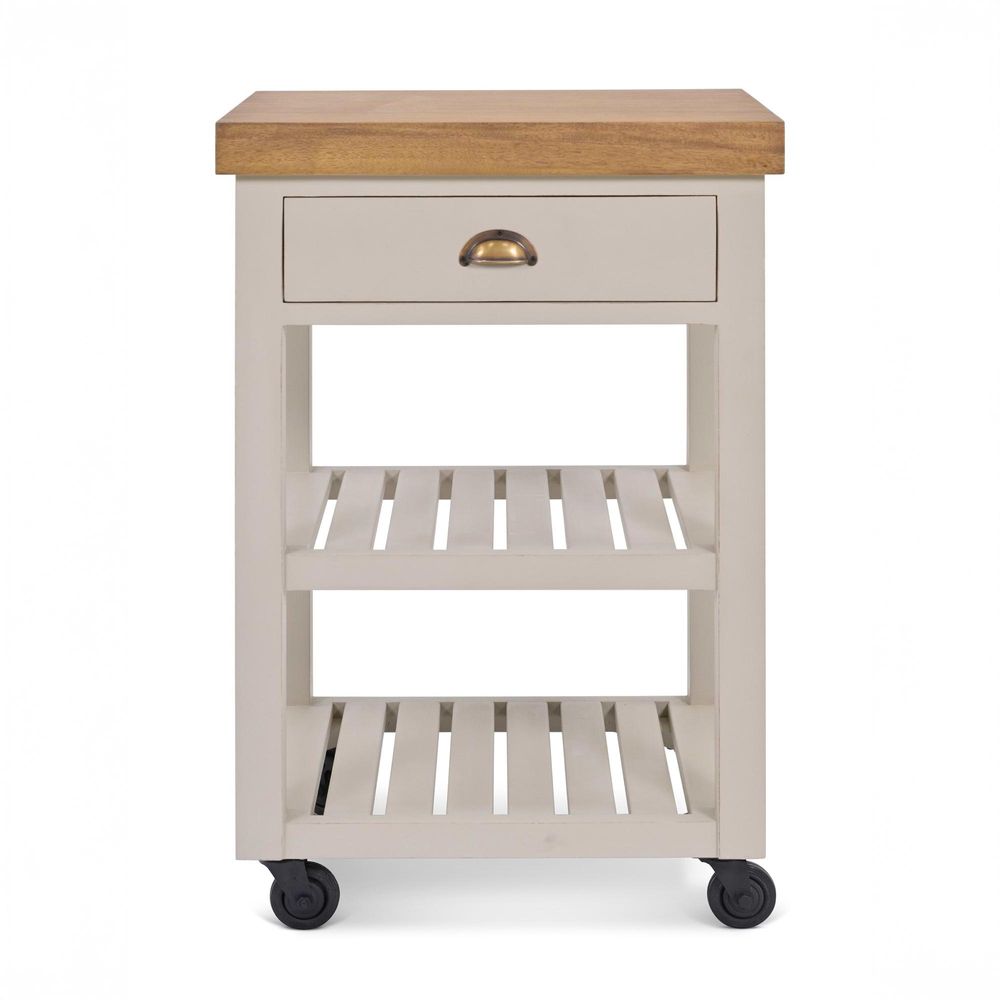 Item Code: FWA1210 A beautiful yet practical addition to the kitchen, our Walcote Butchers Block is bursting with cosy cottage charm. Easy to move around on its black castor wheels, this version has a natural Buyur wood worktop and a clay-coloured base, which is hand-finished by talented Indonesian artisans.The Walcote Butchers Block provides useful extra worktop space, with lots of room for storage beneath it. The drawer with antique brass pull handle is perfect for storing chopping accessories, while the two lower shelves offer plenty of space for stacking pots and pans or baskets full of vegetables. Complete a cottage kitchen aesthetic with our matching Walcote Kitchen Island and Walcote Shelves in clay.Dimensions of drawersW45.9cm x H12cmHeight from floor to first shelf:9.5cmHeight between each shelf26cmFully assembled 1 drawer, on wooden runners x4 black plastic castor wheels for easy mobility Wood care recommendation: regular light dusting with a fine cloth will serve most of the time. When needed, use a lightly dampened cloth to lift dirt, then lightly buff with a fine, dry cloth.