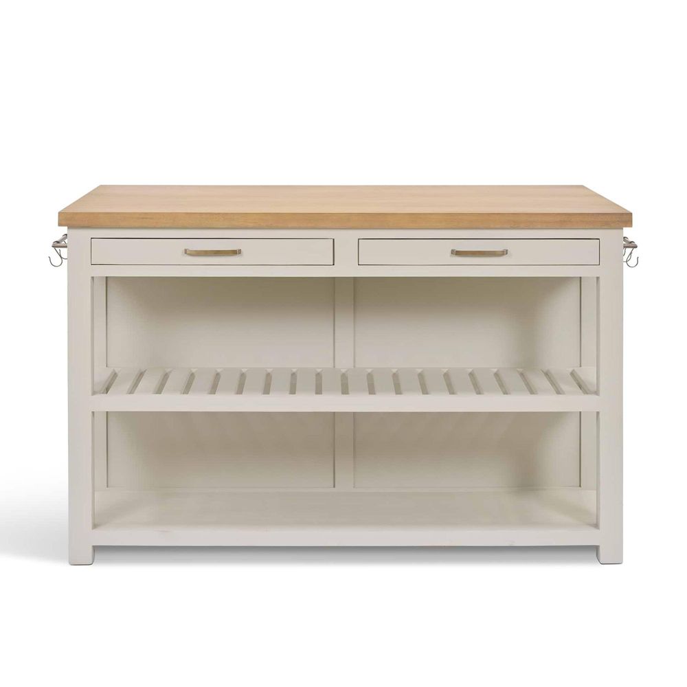 Item Code: FWA1208 Achieve the kitchen of your dreams with our Walcote Kitchen Island. This exquisite premium piece is made from Bayur wood with a natural finish on the top and a clay colour on the base and drawers. Hand-finished by talented artisans in Indonesia, it??s the embodiment of the country kitchen aesthetic.The Walcote kitchen island is packed with useful features, including two spacious drawers and two antique rails with ten brass hooks on either side ?? ideal for hanging tea towels, utensils or bunches of garlic. One side has open shelves that you can use to store pots and pans, crockery and cookbooks, whilst the other has a breakfast bar that just needs our Walcote Bar Stools sliding underneath. Complete the kitchen makeover with our Walcote Butchers Block, Pantry and Shelves in matching clay.Dimensions of drawersW61.5cm x H6.6cmDimensions of shelves:W140cm x L38cm x D4cmPole length55cmFully assembled 2 drawers on wooden runners 10 antique brass hooks included Wood care recommendation: Regular light dusting with a fine cloth will serve most of the time. When needed, use a lightly dampened cloth to lift dirt, then lightly buff with a fine, dry cloth. Max weight shelves and drawers can hold: 5kg.