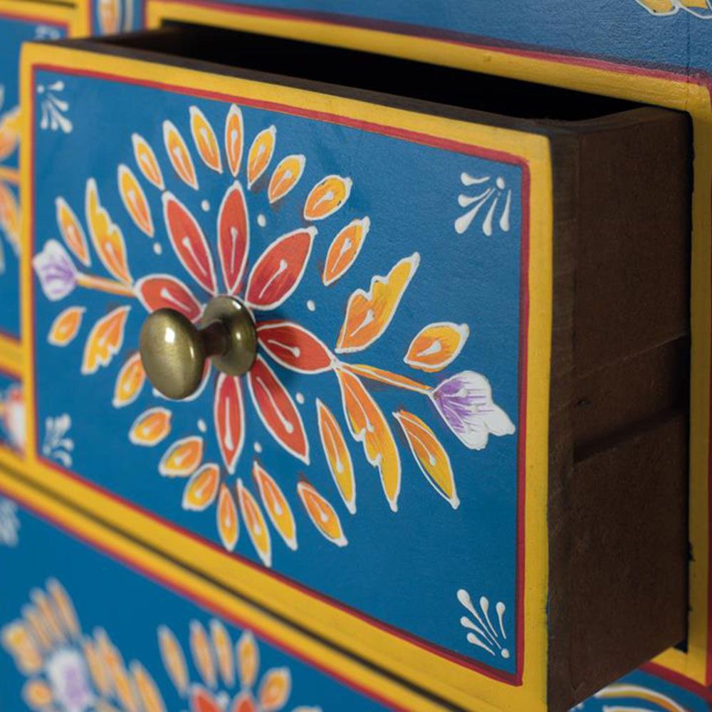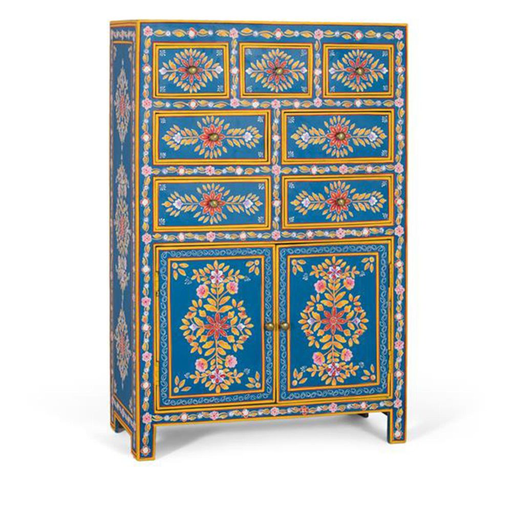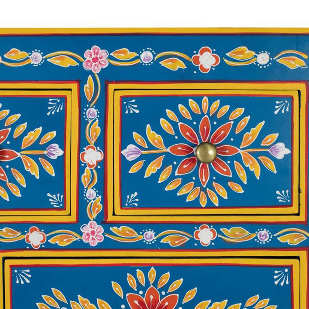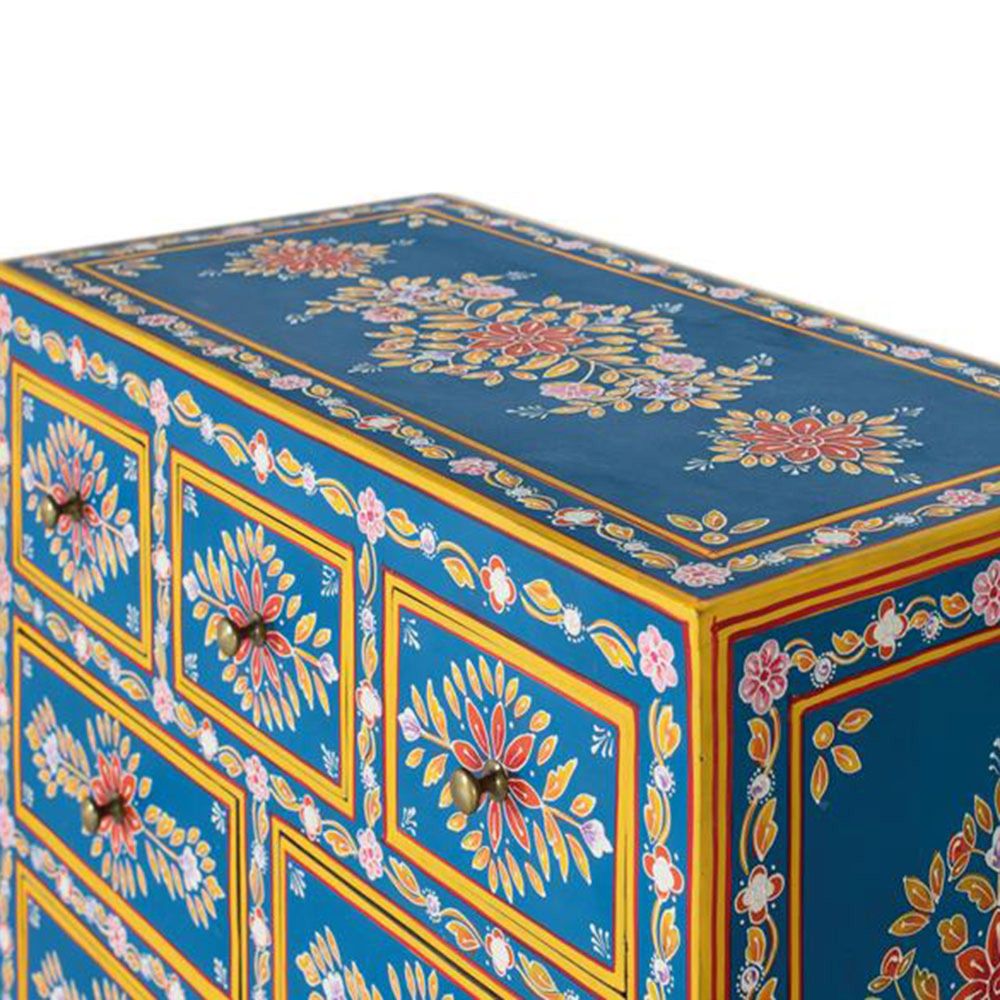 Item Code: 1883 Highboard - Artisanal Multicolored Storage in Mango Wood & MDF. Crafted from a combination of mango wood and MDF, this tall sideboard features a sleek and organized design. It includes seven drawers in various sizes with simple yet functional handles, offering practical and stylish storage solutions. In addition, two doors provide ample space to store larger items. Hand-painted details adorn the drawer fronts and doors, adding a handcrafted and personalized touch to the piece.