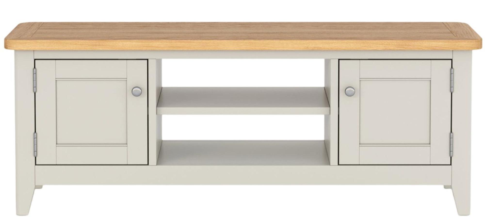 Item Code: YNP-06 At an impressive 120cm wide, this is a unit that will cope with most screen sizes. It has storage functionality too, in the shape of a shelved section nestling between two cupboards. The front and sides are painted soft grey, with silver metal handles on the cupboard doors. The top is sturdily constructed from matt lacquered oak and oak veneer.