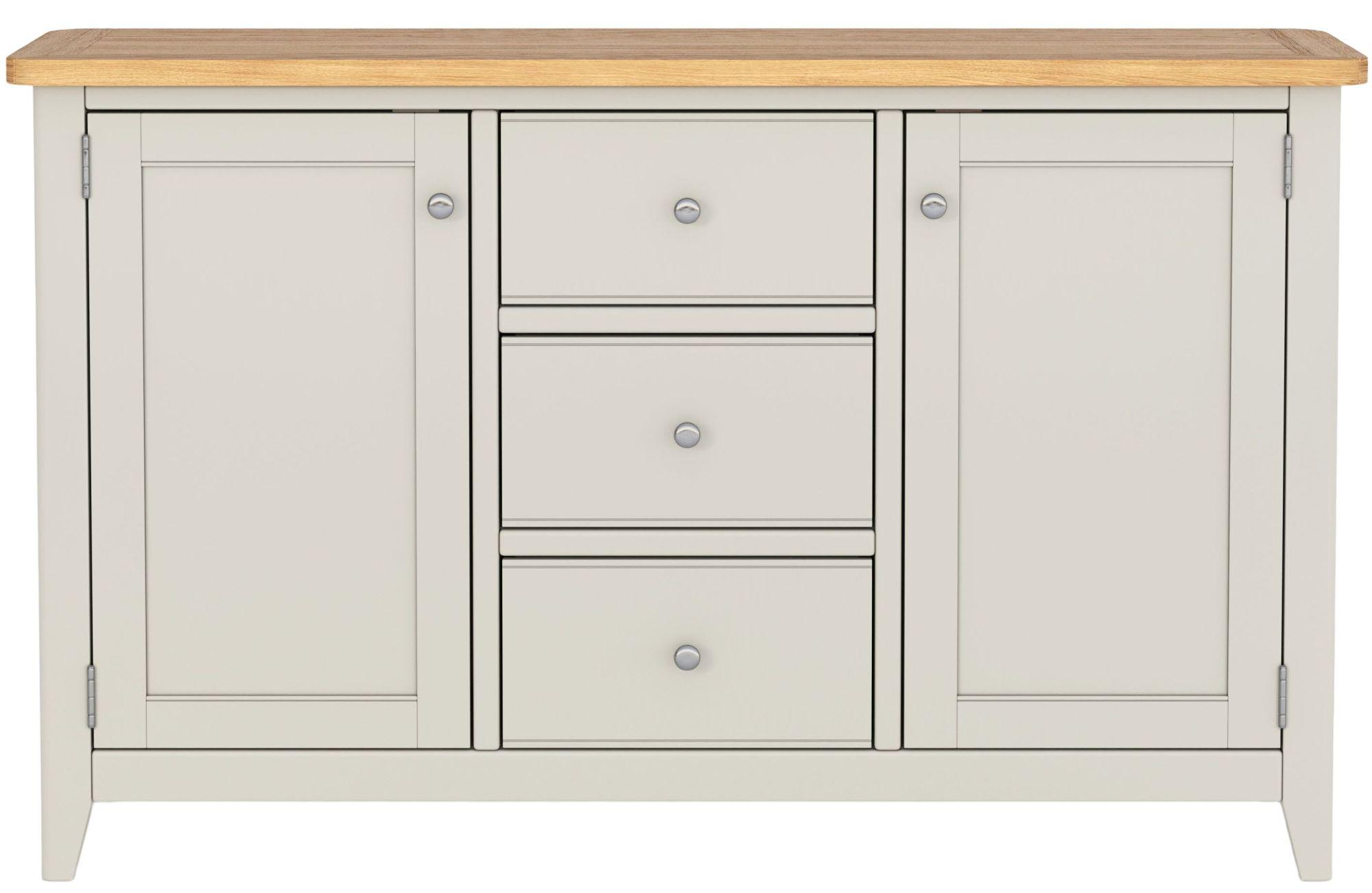 Item Code: YNP-03 Large sideboard featuring the convenience of three capacious drawers, for cutlery, napkins and whatever else you need to store. These are flanked by two sizeable cupboards, each of which has an adjustable shelf within. The soft grey front and sides are complemented beautifully by the oak and oak veneer top and the whole unit boasts gracefully rounded edges and tapered legs.