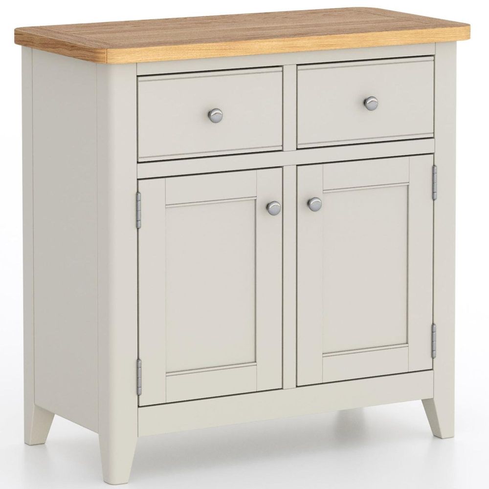 Item Code: YNP-05 For when you need a sideboard with reduced width and height, the Arden Mini Sideboard is an ideal choice. It will fit snugly under a window or counter, at the same time as delivering substantial storage with two drawers and under-cupboard (with adjustable shelf). Painted soft grey and surmounted with an oak and oak veneer top, this is a mini-marvel.