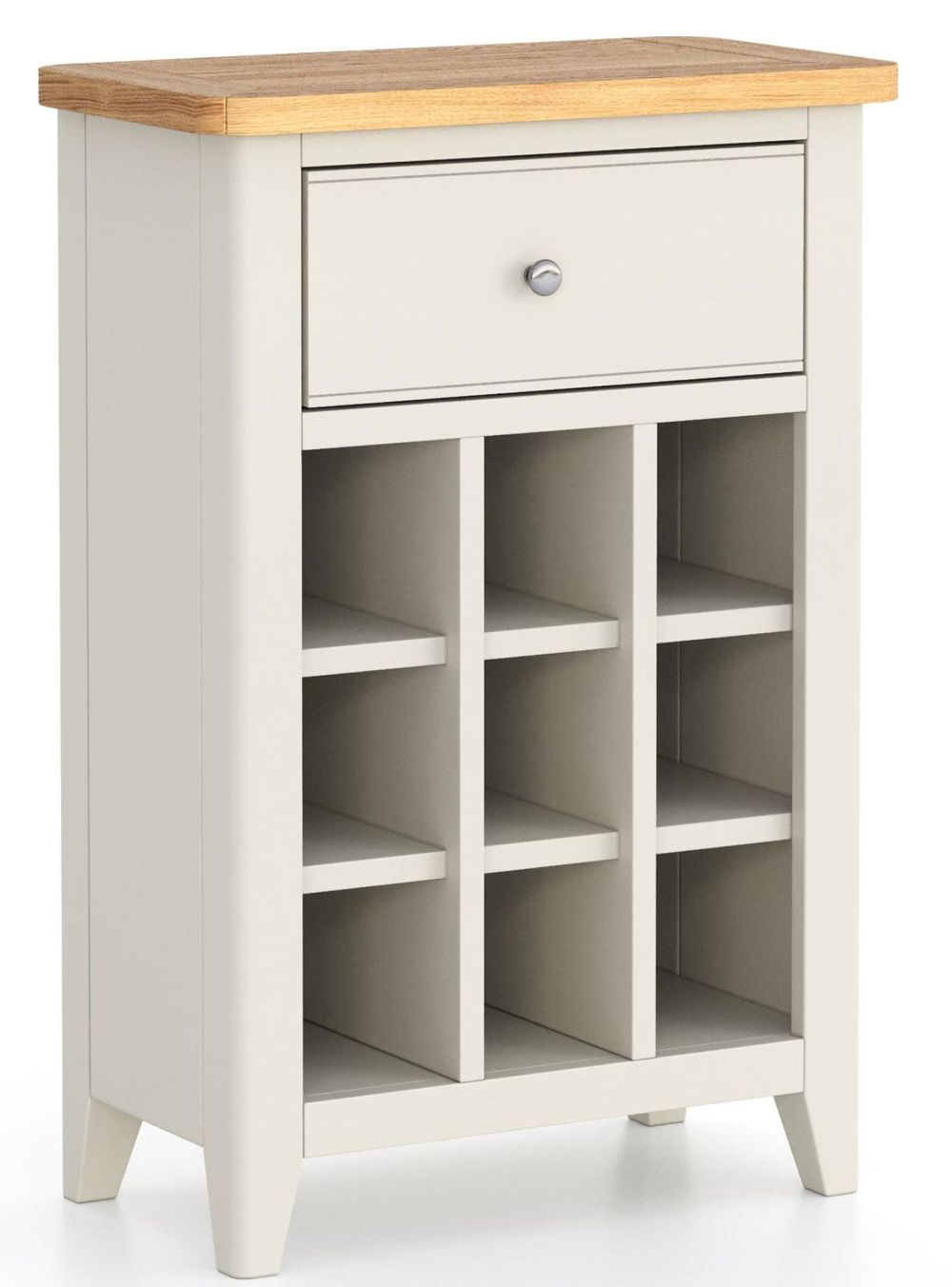 Item Code: YNP-18 There's space for no fewer than nine bottles of wine in this stylish and attractive farmhouse-look cabinet, painted soft grey with a matt lacquered oak and oak veneer top. There's also a silver-handled drawer, perfect for a corkscrew, a wine catalogue and even a notebook for your thoughts on various vintages, and the whole thing sits on slightly tapered legs.