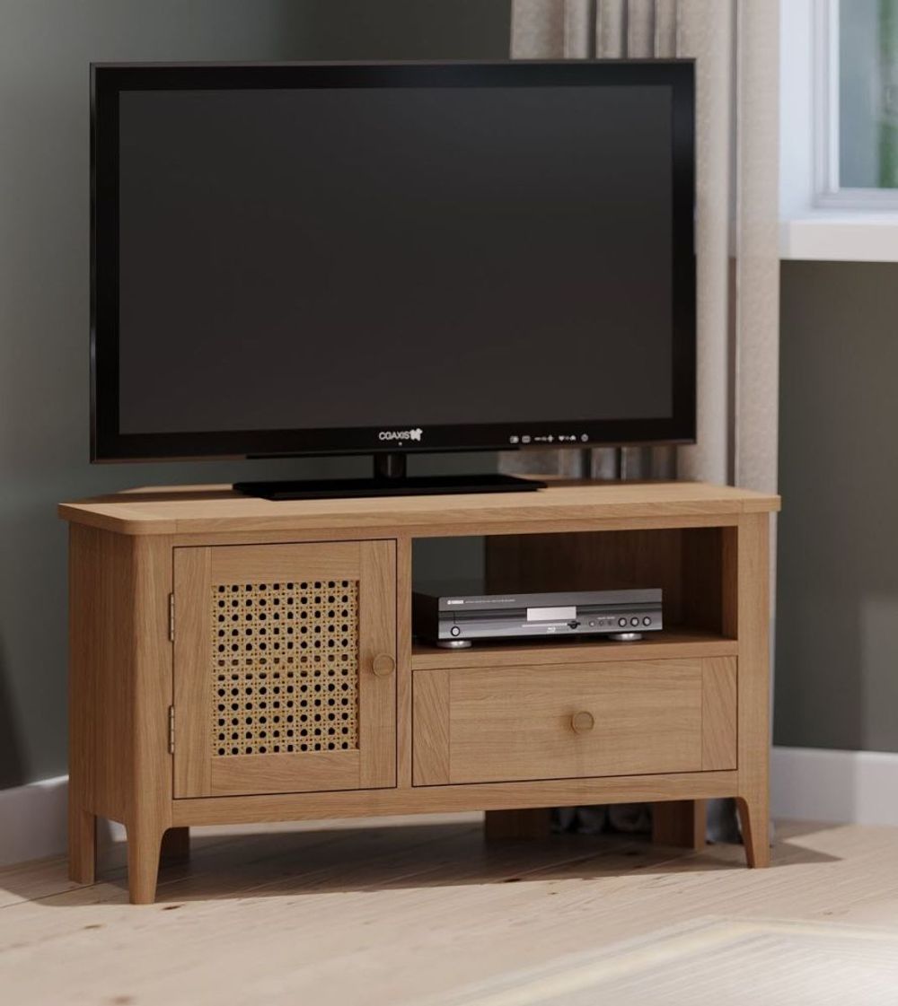 Item Code: AM-06 This corner TV unit is the perfect way to stylishly store your television. Constructed with natural oak and rattan, it features 2 shelves and 1 door with 1 drawer, providing ample media storage. A great way to bring charm and organisation to your living space.
