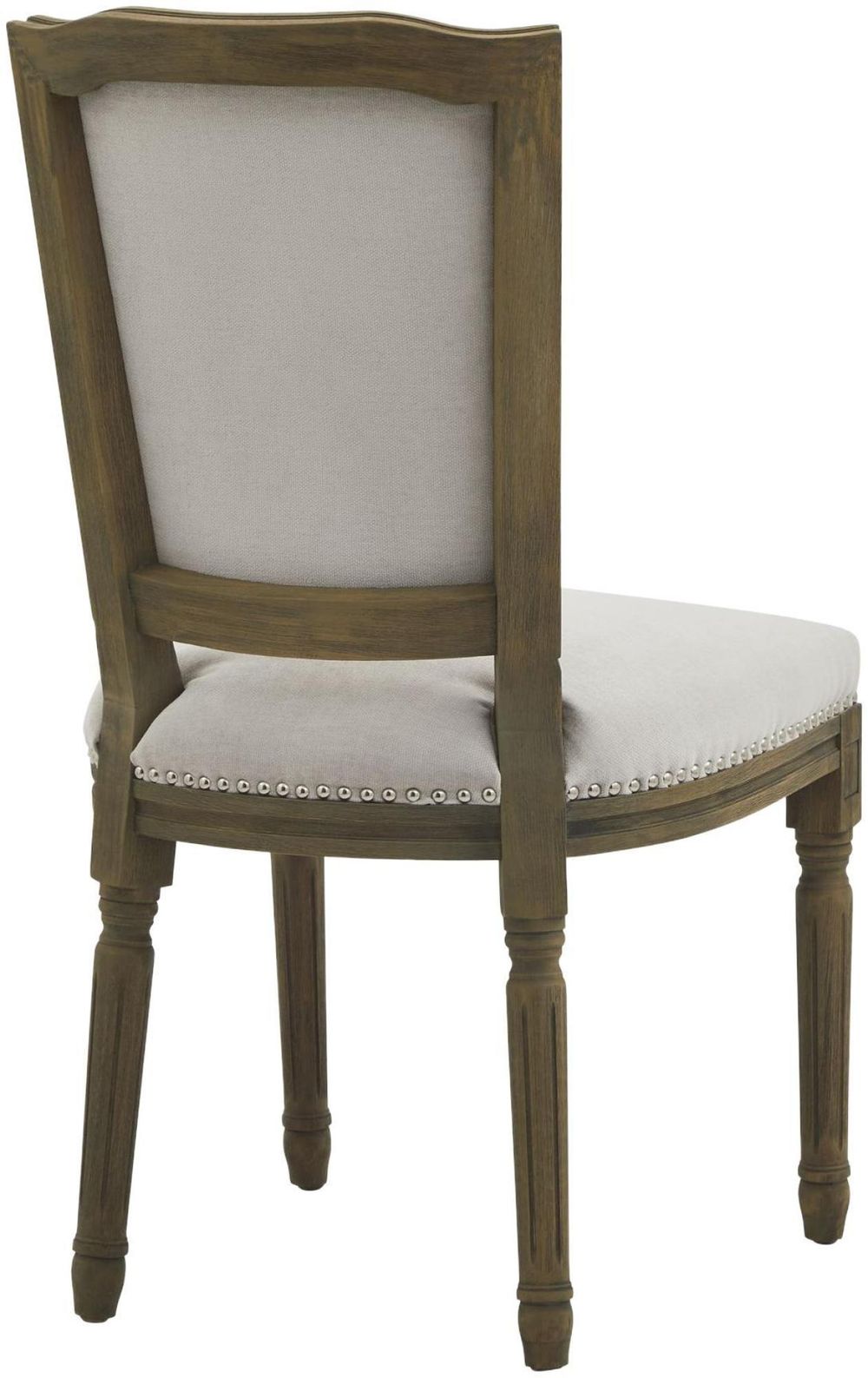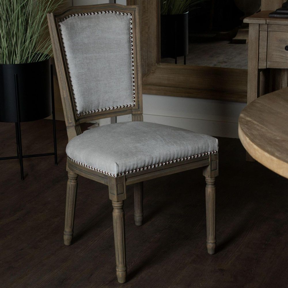 This is the Clare Grey Dining Chair. Its rubberwood frame, known for its dense grain and strength, is the perfect choice for its intended everyday use. The Clare chair, upholstered in a grey woven fabric, is a perfect partner to the Baltimore Collection’s dining tables, thanks to its washed wood finish. Beautiful handcarved details to the frame really finishes its look.