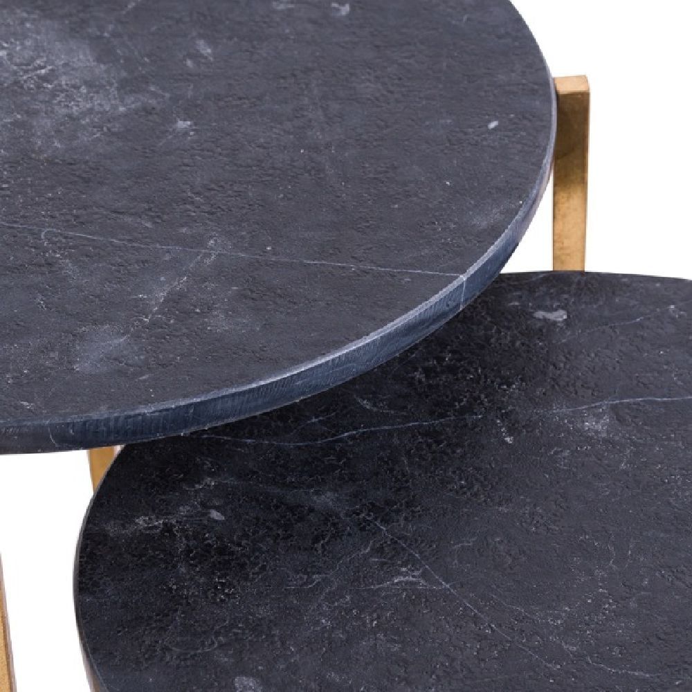 Item Code: 20802 A Set of 2 Gold and Black Marble Tables utilising an on-trend combination of materials that will provide an eye-catching focal point. Each circular black marble surface is inset into a beautifully contrasting gold finished metal frame. The hardwearing marble top is ideally suited to the function of side table and has a wonderfully textured effect, akin to leather, to its finish.