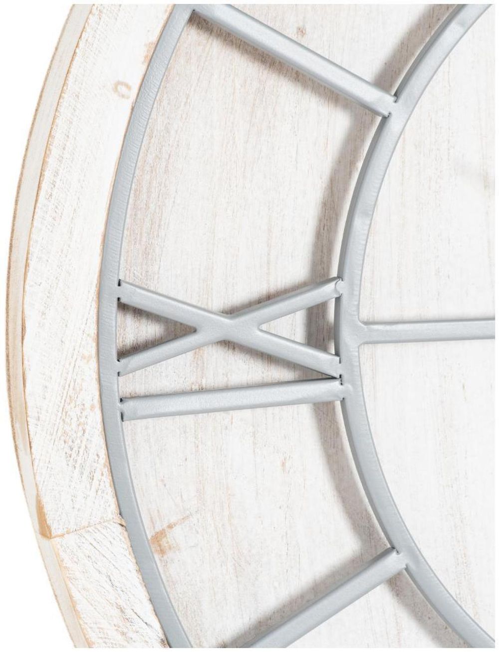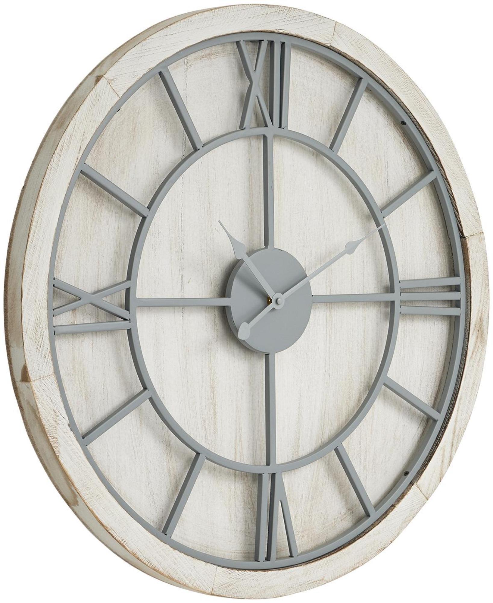 This is the Victoria White Wall Clock. An eye-catching round wall clock which will fit with a variety of decor schemes. The light grey metal roman numerals and movement gains great stand-out against its white washed wood surround. Supplied with hook for wall mounting already attached to the frame, this timepiece will be simple to hang and immediately enjoy. Add 1 x AA battery to start the clock mechanism.