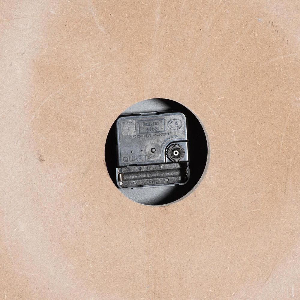 An eye-catching wall clock comprised of a wooden base overlaid with a roman numeral clock face in a contrasting light grey metal.