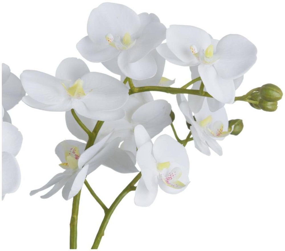 This is the White Orchid in Glass Pot. A sophisticated home addition that will add an air of serenity and elegance wherever it's placed. This faux orchid boasts a botanical accuracy second to none. From the realistic root network spilling from the rustic white glass to the variety of opened blooms and closed buds, every care has been taken in its creation. This faux plant would look fantastic as a dining table or kitchen island centrepiece.