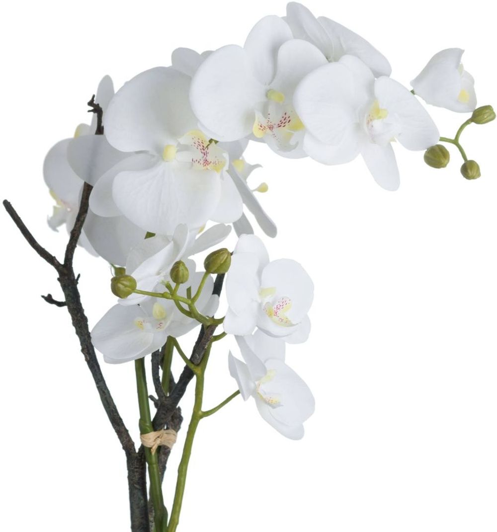 Item Code: 19956 This is the White Orchid in Stone Pot. A classy home addition that will add an air of serenity and elegance wherever it's placed. This faux orchid boasts a botanical accuracy second to none. From the realistic root network spilling from the rustic white stoneware pot to the variety of opened blooms and closed buds, every care has been taken in its creation. This faux plant would look fantastic as a dining table or kitchen island centrepiece.