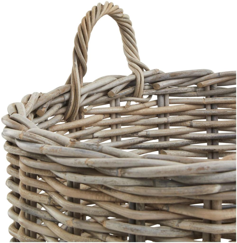This is the Set of 3 Kubu Rattan Round Storage Baskets. Our sets of 3 rattan baskets are available in two shapes: round and square. This is the round option and has two handles for ease of handling. The set's neutral rattan finish is a big tick with the current trend for natural textures. These versatile storage items could be used for all manner of uses. Store your cosiest blankets in one and your kindling another, whilst displaying a faux plant in the third.